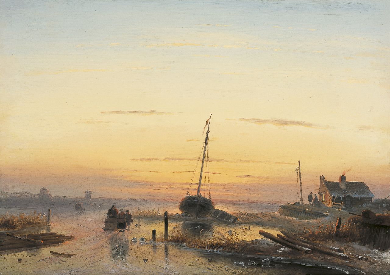 Charles Leickert kunstwerk • schilderij • voorheen te koop Winterlandschap bij ondergaande zon