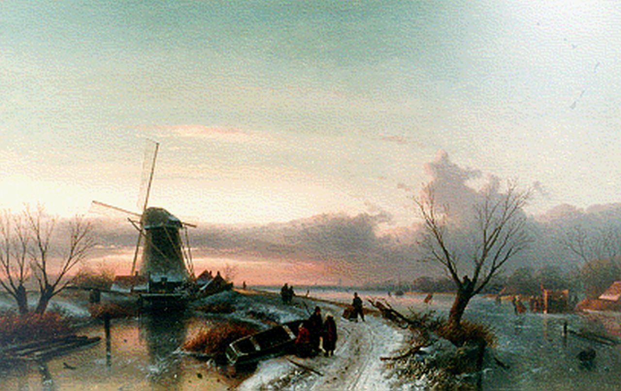 Charles Leickert kunstwerk • schilderij • voorheen te koop Winterlandschap bij zonsondergang