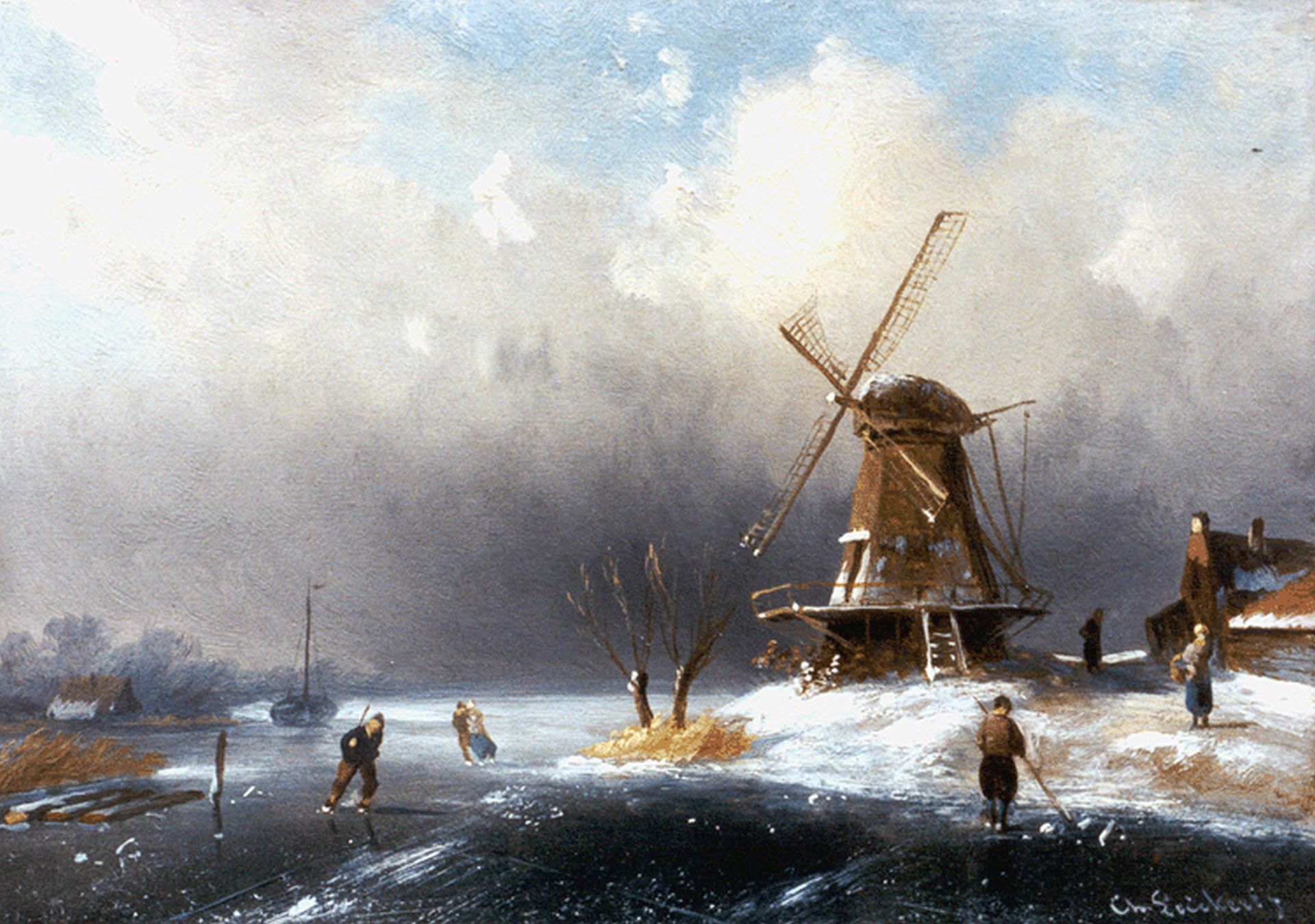 Charles Leickert kunstwerk • schilderij • voorheen te koop Winterlandschap met schaatsers bij een molen