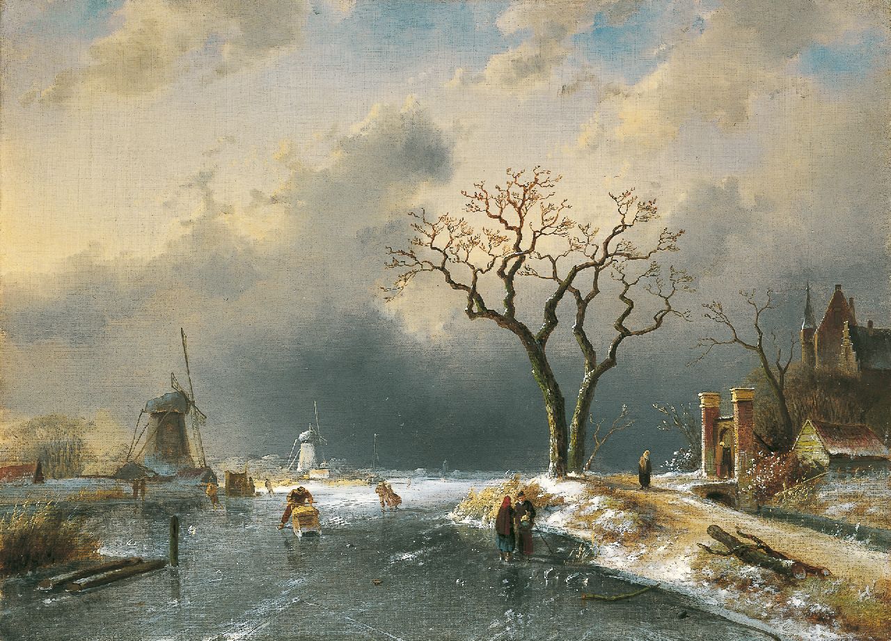 Charles Leickert kunstwerk • schilderij • voorheen te koop Winterlandschap met schaatsers en koek-en-zopie