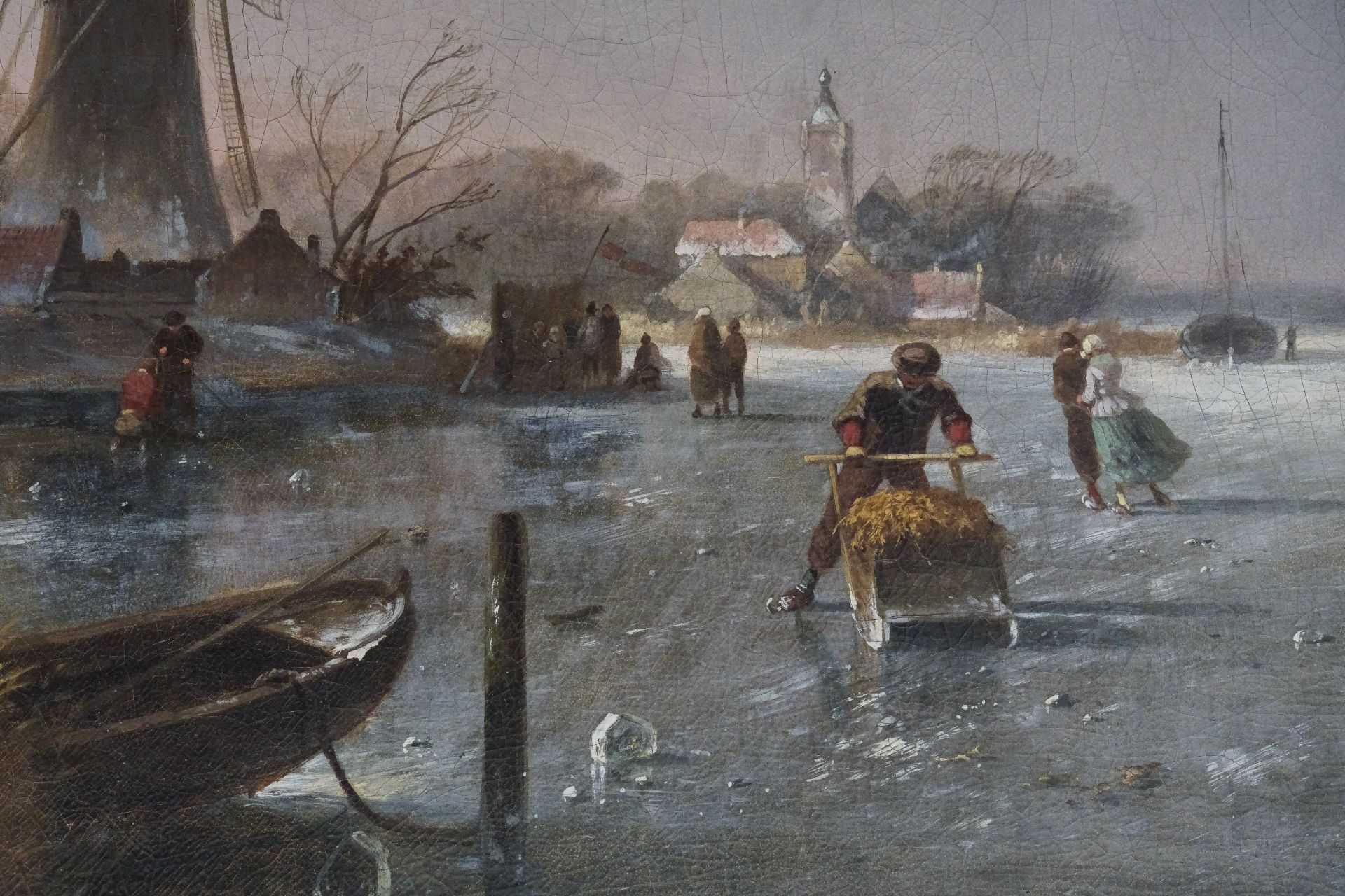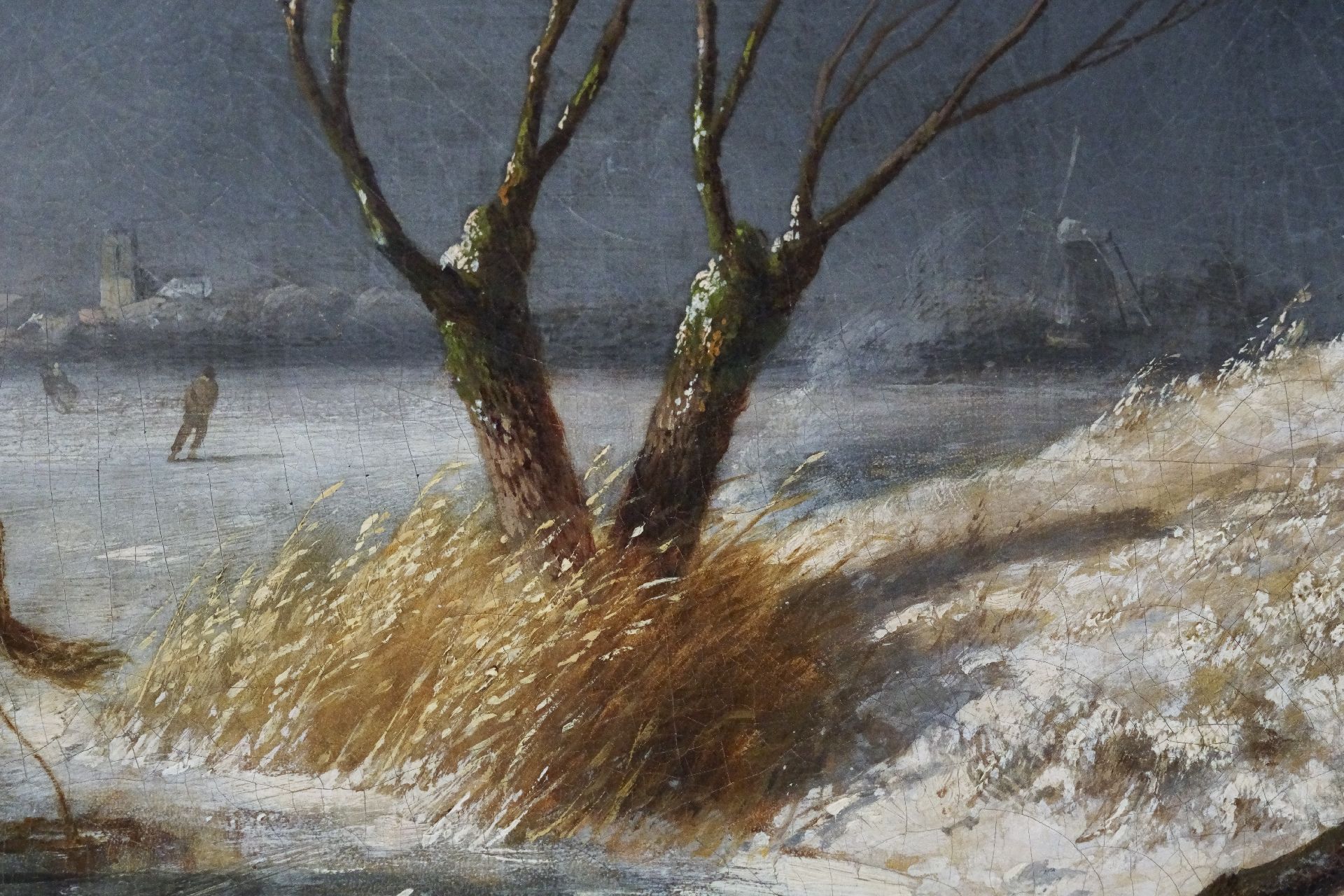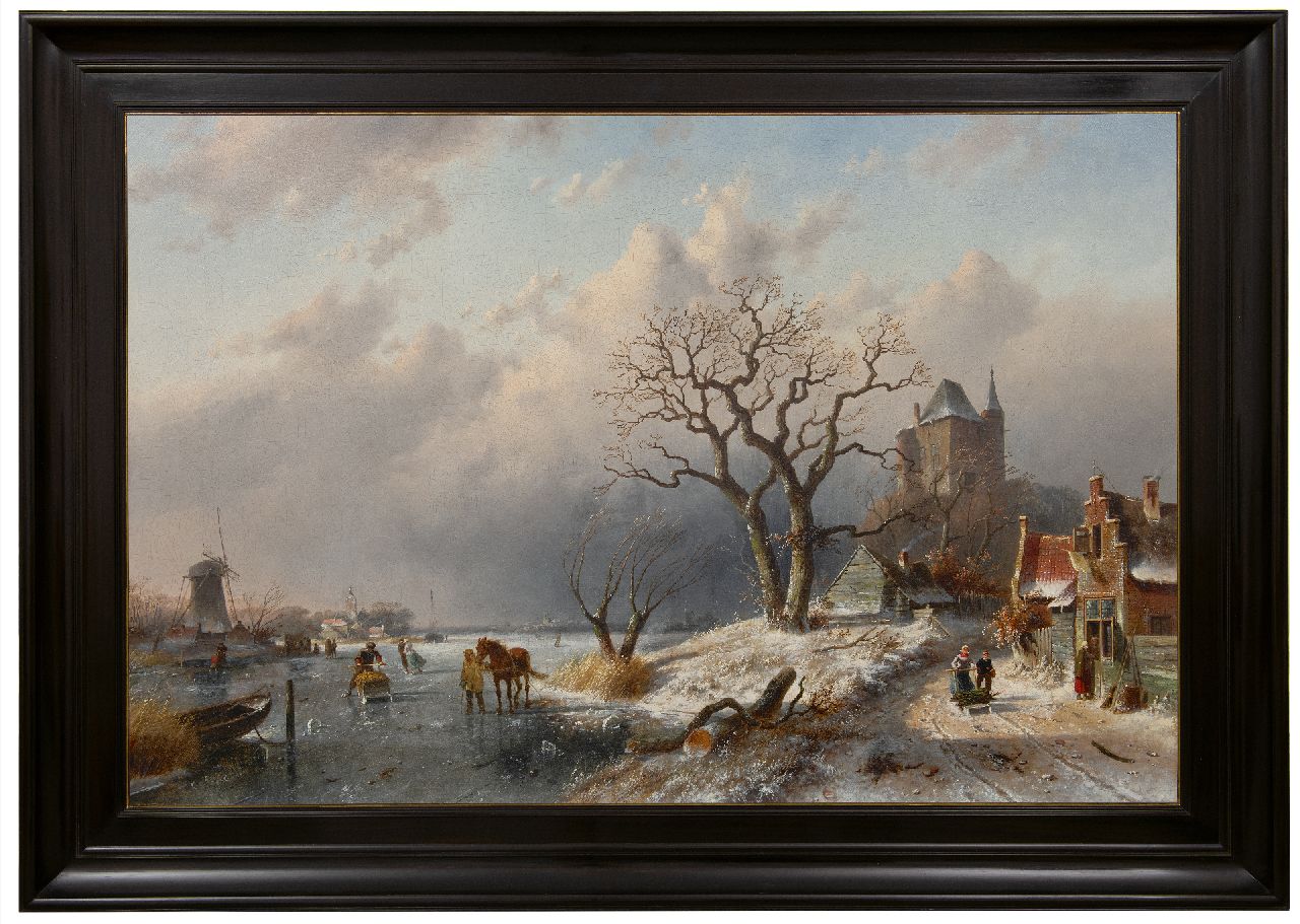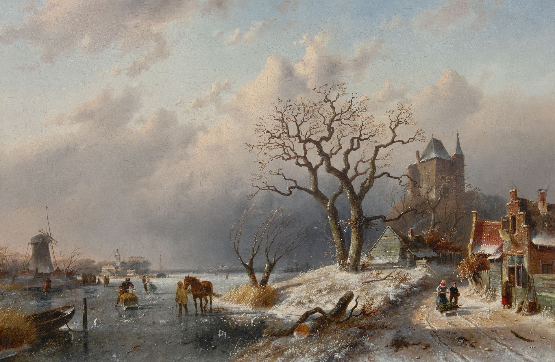 Charles Leickert kunstwerk • schilderij • voorheen te koop Winterlandschap met schaatsers en landvolk op een pad