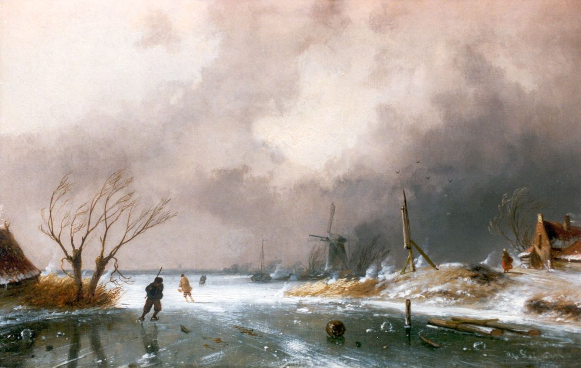 Charles Leickert kunstwerk • schilderij • voorheen te koop Winterlandschap met schaatsers op een rivier
