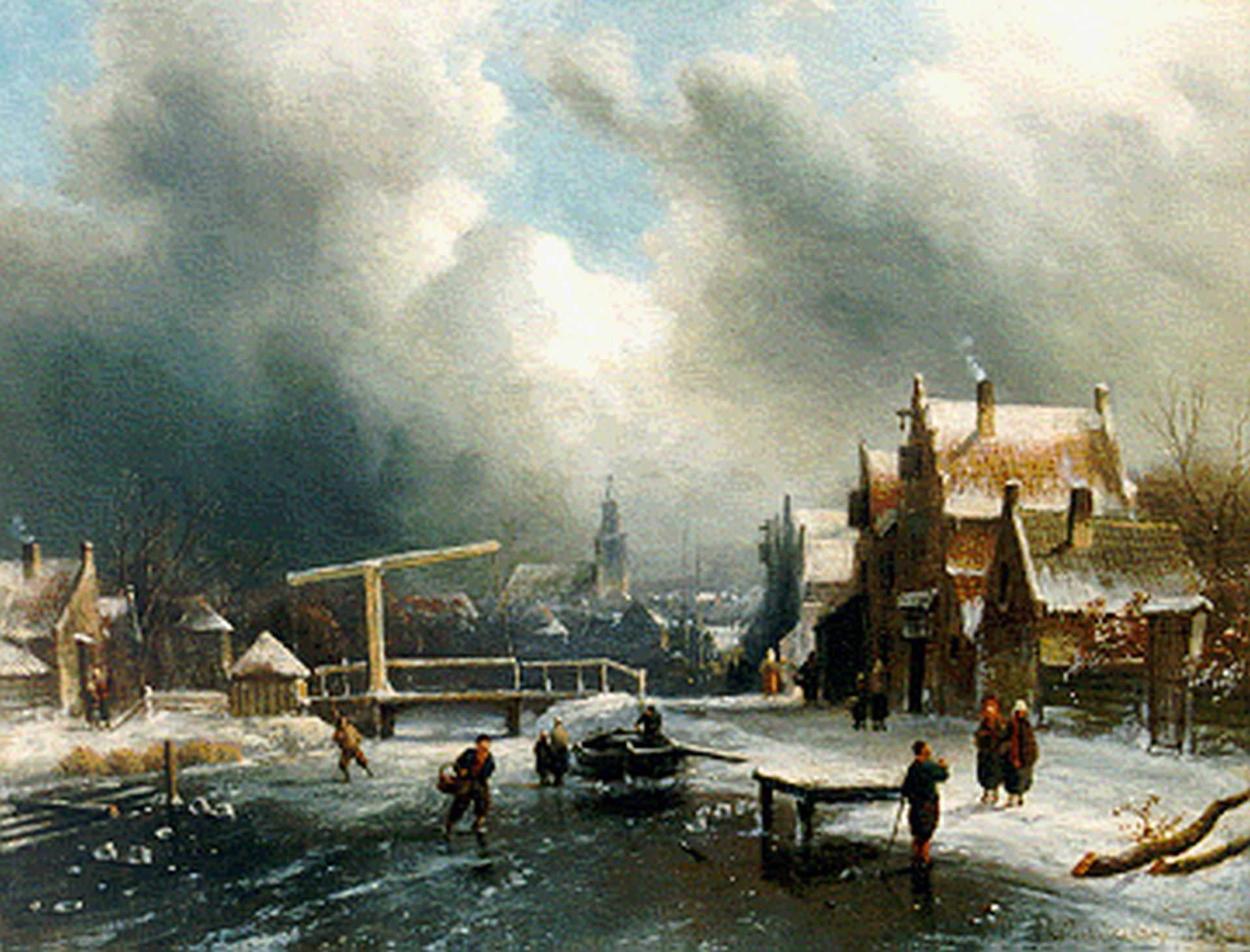 Charles Leickert kunstwerk • schilderij • voorheen te koop Winterlandschap met schaatsers