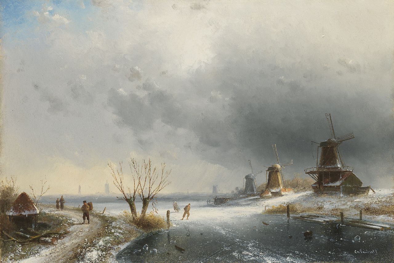 Charles Leickert kunstwerk • schilderij • voorheen te koop Winters rivierlandschap met poldermolens en figuren