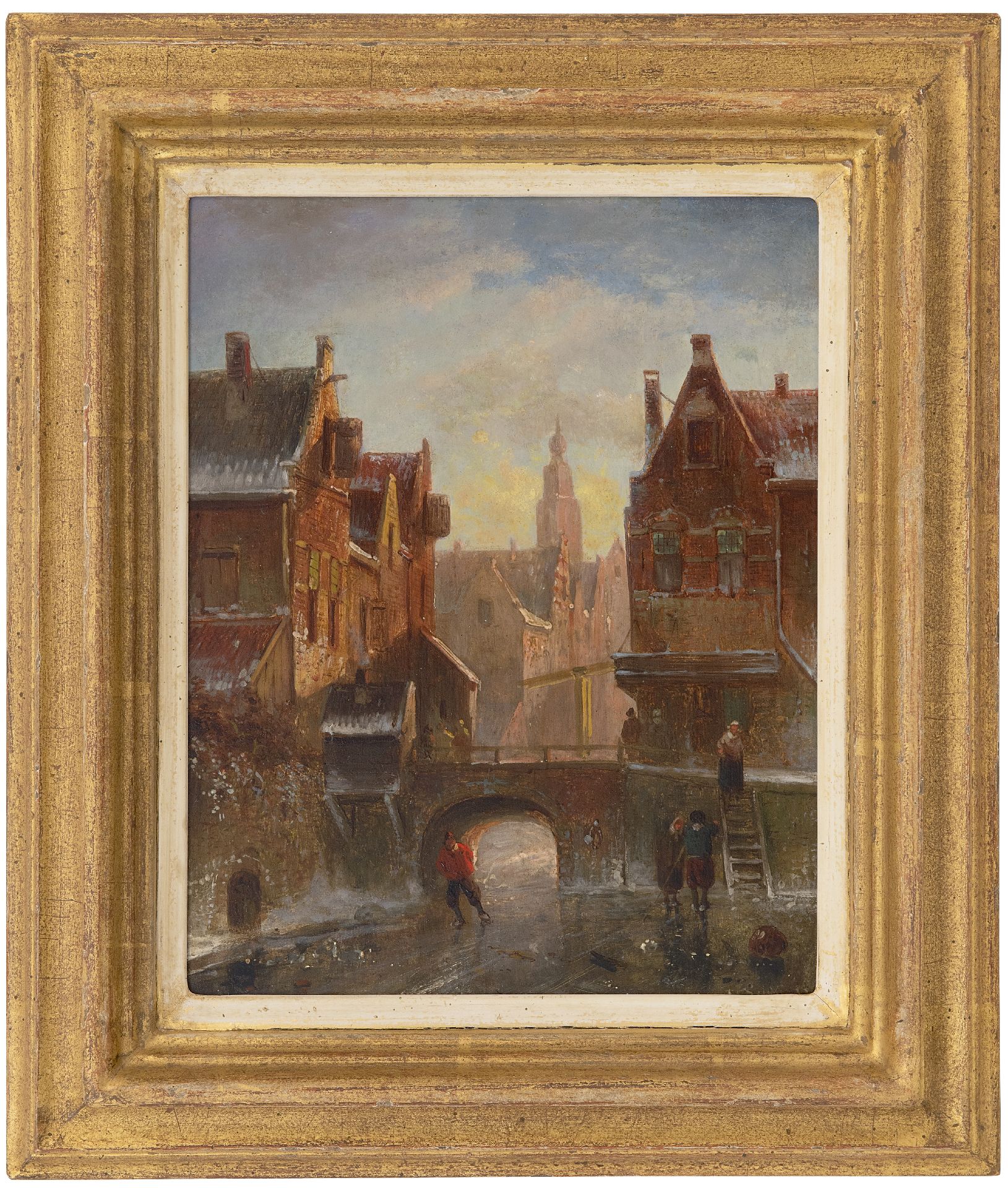 Charles Leickert kunstwerk • schilderij • voorheen te koop Winters stadsgezicht met figuren op het ijs