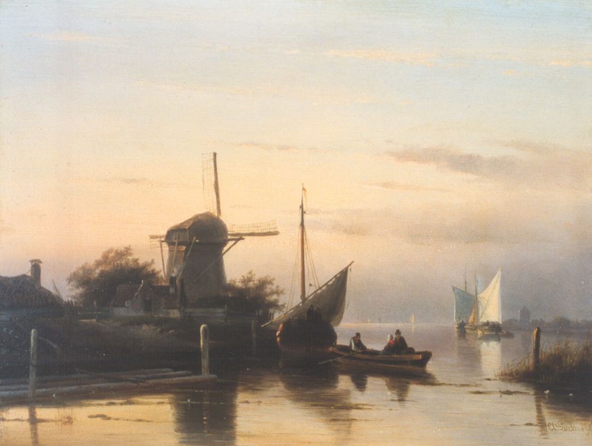 Charles Leickert kunstwerk • schilderij • voorheen te koop Zeilschepen en roeiboot op stil water