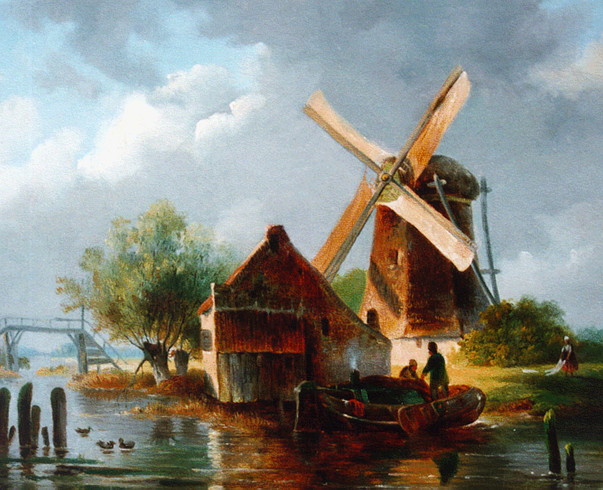 Charles Leickert kunstwerk • schilderij • voorheen te koop Zomerlandschapje met molen aan rivier
