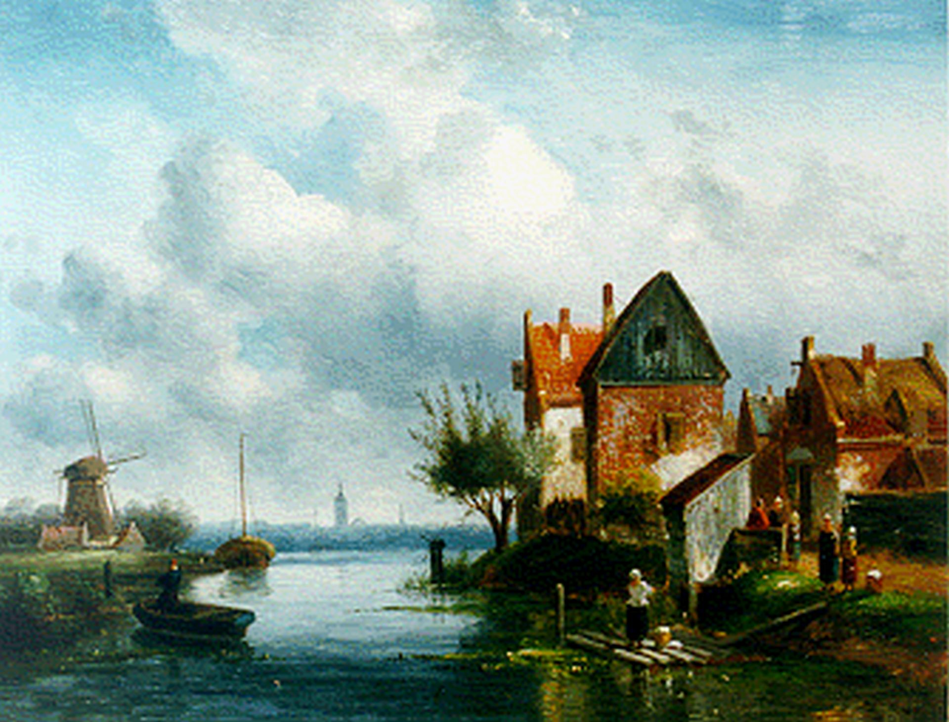 Charles Leickert kunstwerk • schilderij • voorheen te koop Zomers dorpsgezicht met wasvrouwen