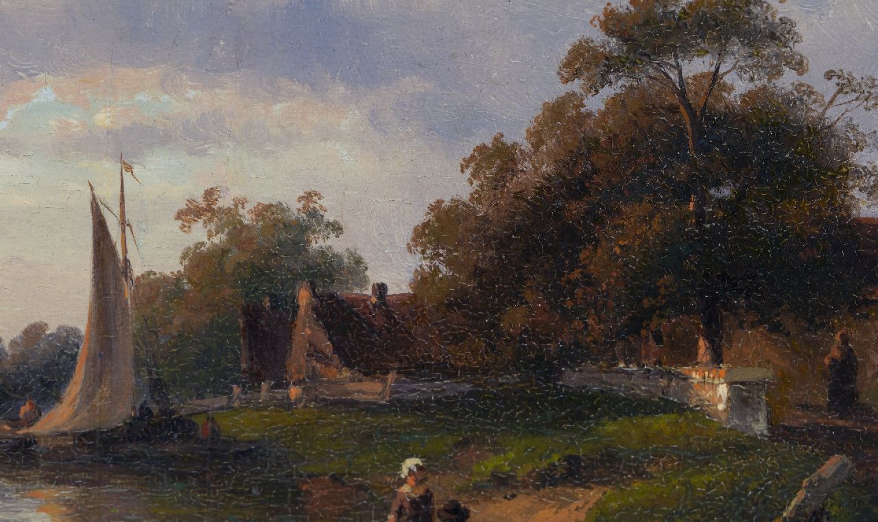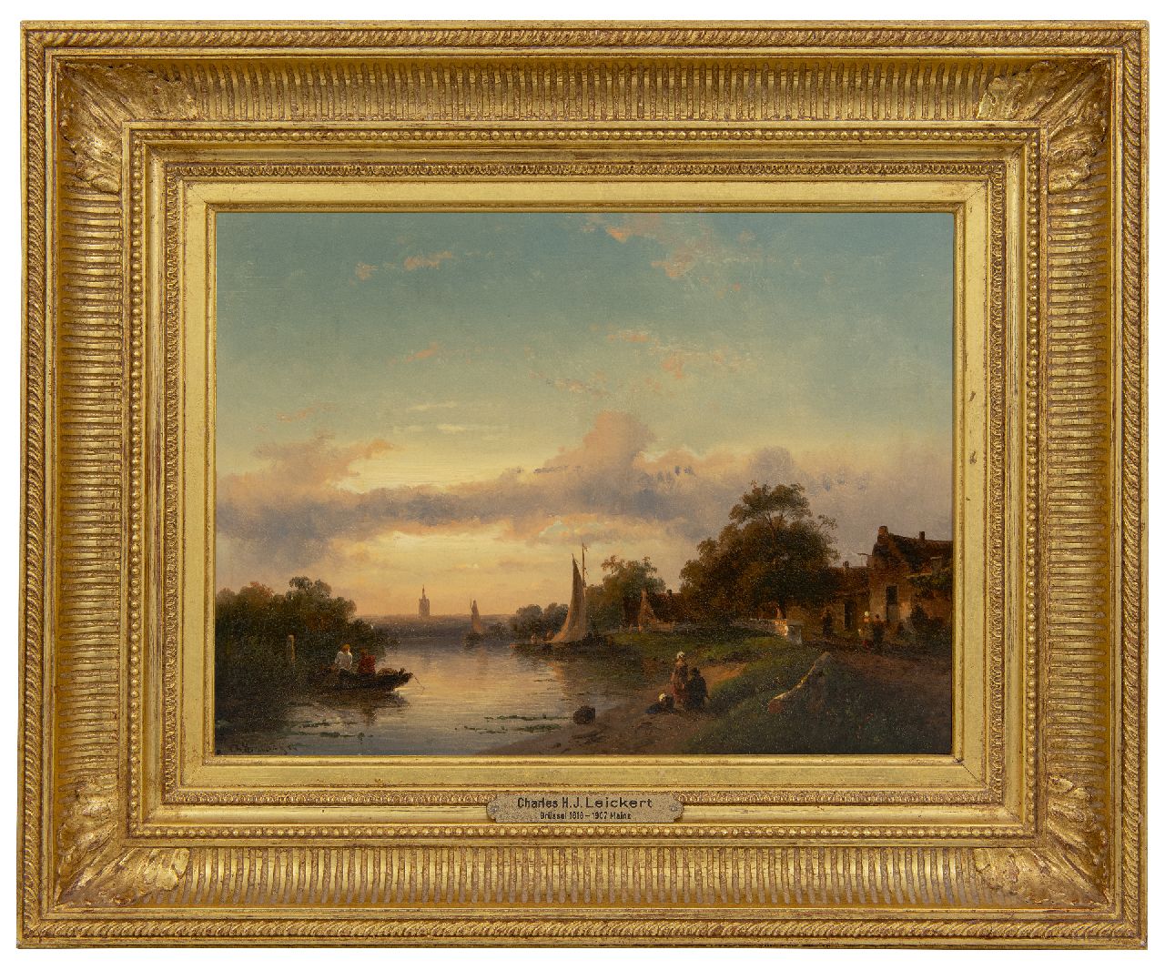 De aantrekkingskracht van de schilderijen van Charles Leickert wordt vooral bepaald door de lichtval en sterk verhalende details. Hij was een echte vakman, die op knappe wijze de juiste stemming kon weergeven en daarmee de smaak van het publiek goed aanvoelde. Zijn wintergezichten zijn echt koud, zijn zomers zonnig en groen. Leickert begint zijn opleiding aan de Haagsche Teekenacademie en werkt tegelijkertijd in het atelier bij Bart van Hove, schilder van stadsgezichten en toneeldecors. Na afronding van de Teekenacademie vervolgt Leickert zijn studie in het atelier van Wijnand Nuijen. Na diens overlijden – hij werd slechts 26 jaar – zet Leickert zijn atelierstudie voort bij Andreas Schelfhout, waar hij zich meer en meer toelegt op het schilderen van landschappen, in het bijzonder winters. In 1850 vertrekt Leickert naar Amsterdam en vanaf die tijd worden zijn onderwerpen steeds gevarieerder. Waren de torens van Dordrecht, Woudrichem en Schiebroek, onder invloed van Nuijen, een vaak voorkomend motief in zijn vroegere werk, nu schildert hij vaak aan de waterkant, langs het strand en de rivieren – op plekken met veel bedrijvigheid. Er is volop plek voor het uitbeelden van de schoonheid van de natuur; een gelaagde lucht, die een naderende sneeuwbui lijkt aan te kondigen en een blauwgrijs bevroren rivier met een prachtige lichtinval halverwege de horizon. Leickerts ‘heimwee’ schilderijen boden houvast aan mensen die moeite hadden met de snel veranderende samenleving. Eigentijdse motieven als treinen en stoomschepen, zoals Schelfhout ze gebruikte, komen in zijn schilderijen niet voor. Liever legde hij een tijdloos landschap vast dat een weergave is van de schoonheid van de natuur.