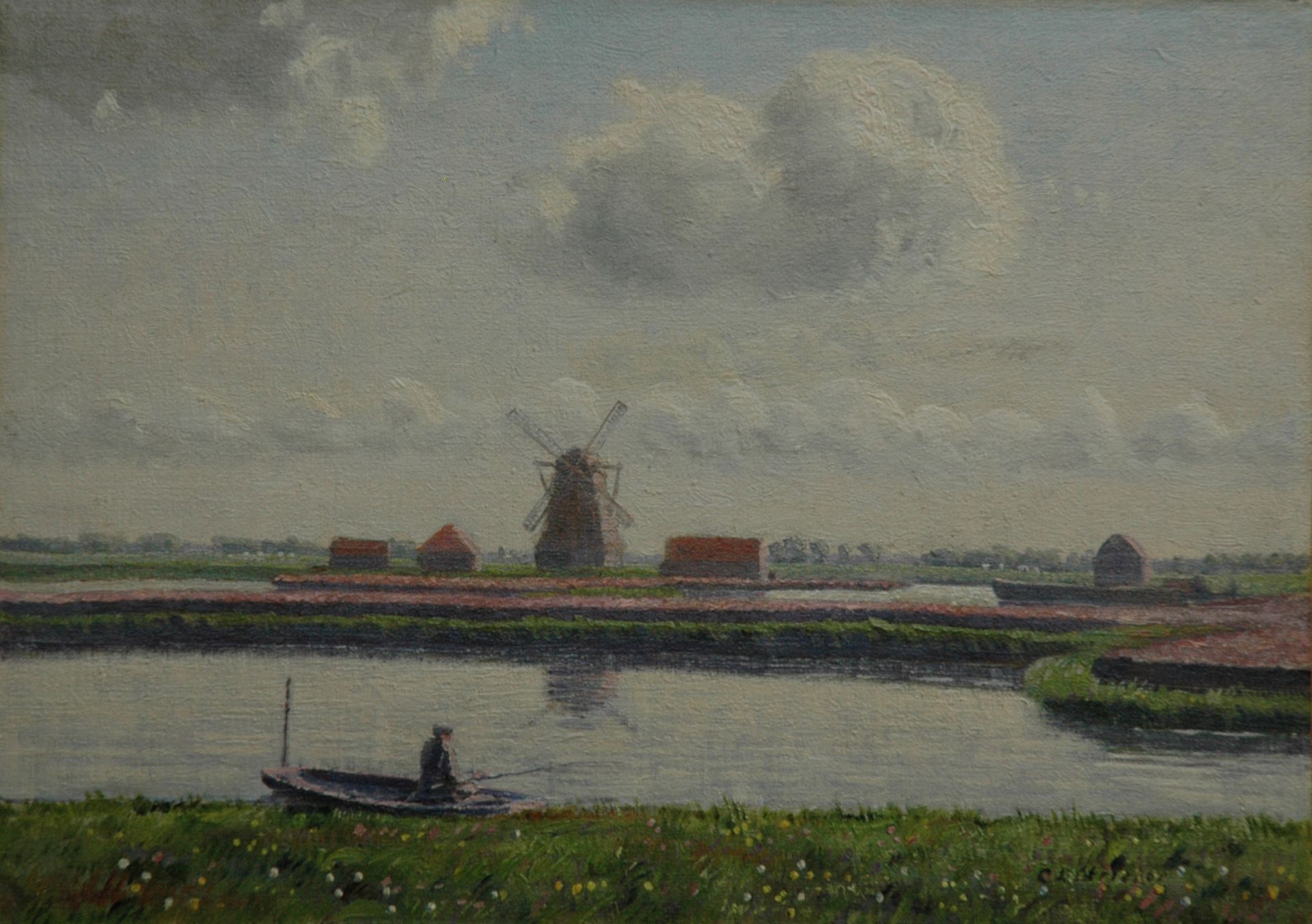 Charles Ludwig Stricker kunstwerk • schilderij • voorheen te koop Landschap bij Nieuwer-Amstel, met de Koenenmolen en bollenvelden