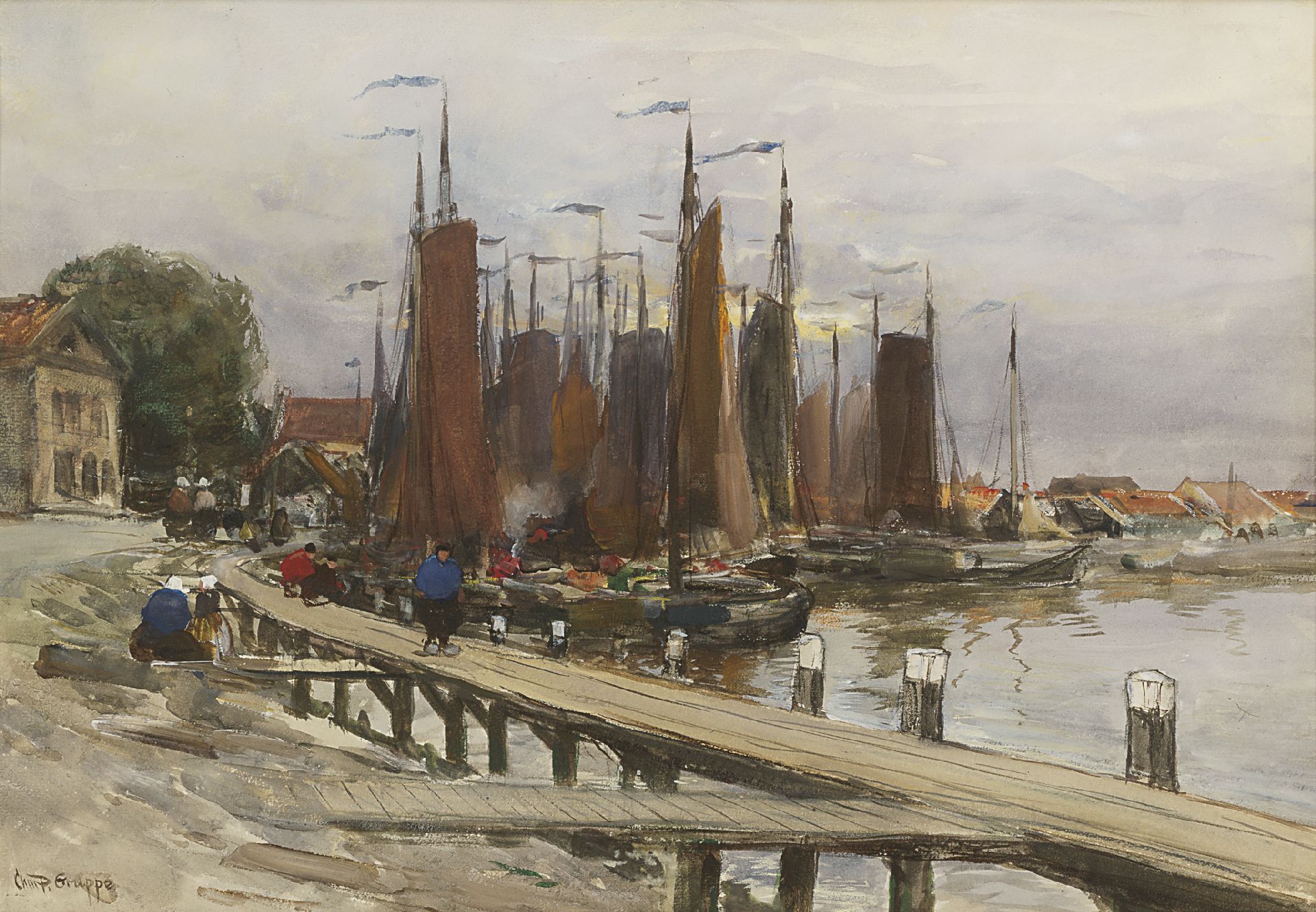Charles Paul Gruppe kunstwerk • aquarel • tekening • voorheen te koop De haven van Volendam