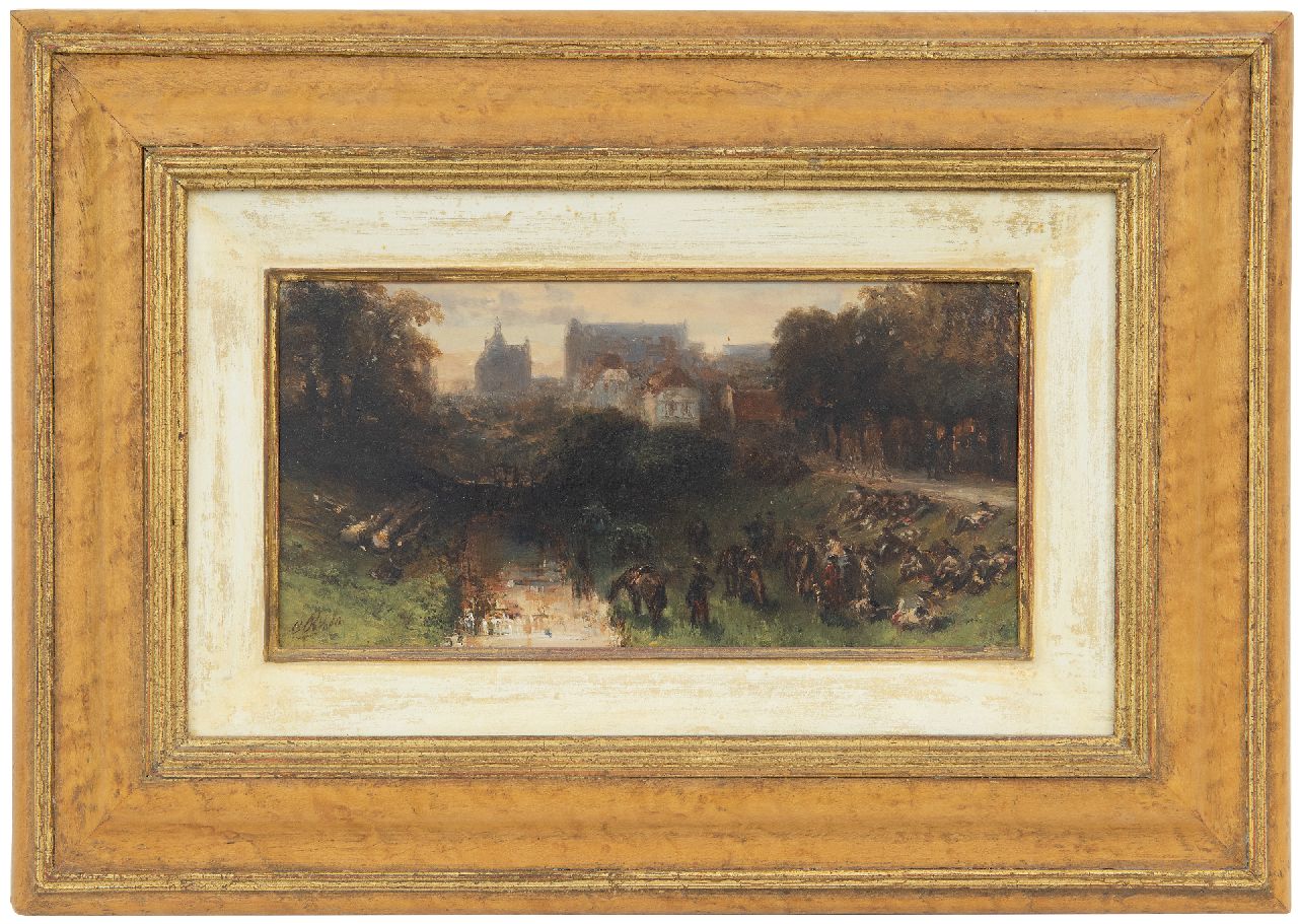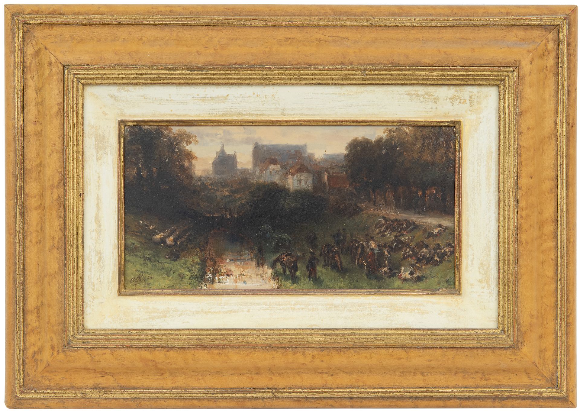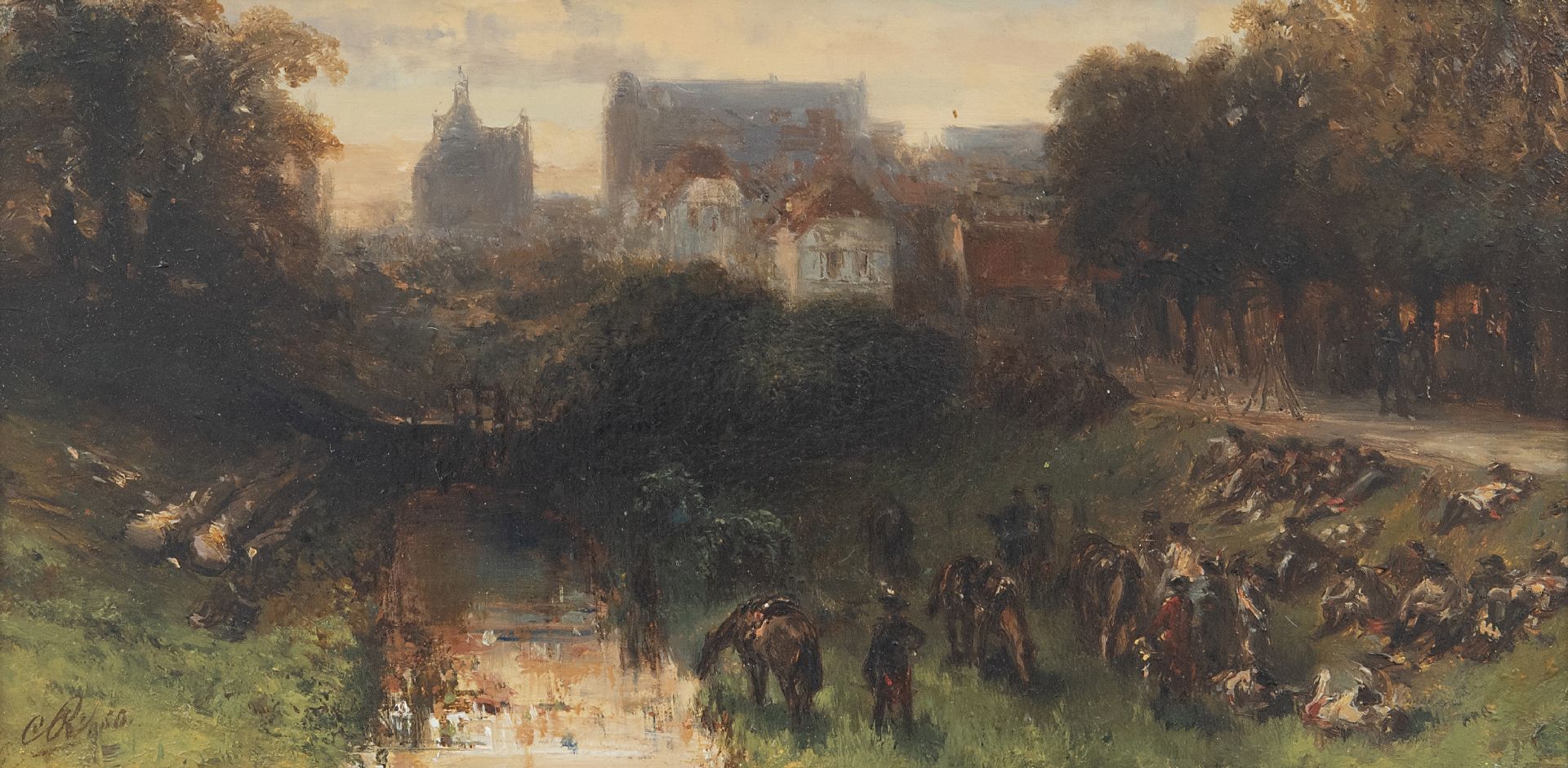 Charles Rochussen kunstwerk • schilderij • voorheen te koop Rustende Franse cavaleristen bij een grote stad