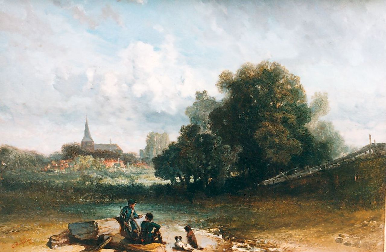 Charles Rochussen kunstwerk • schilderij • voorheen te koop Rustende jagers aan de oever van de rivier