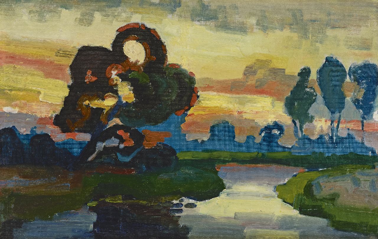 Chris Lanooy kunstwerk • schilderij • voorheen te koop Rivierlandschap bij ondergaande zon