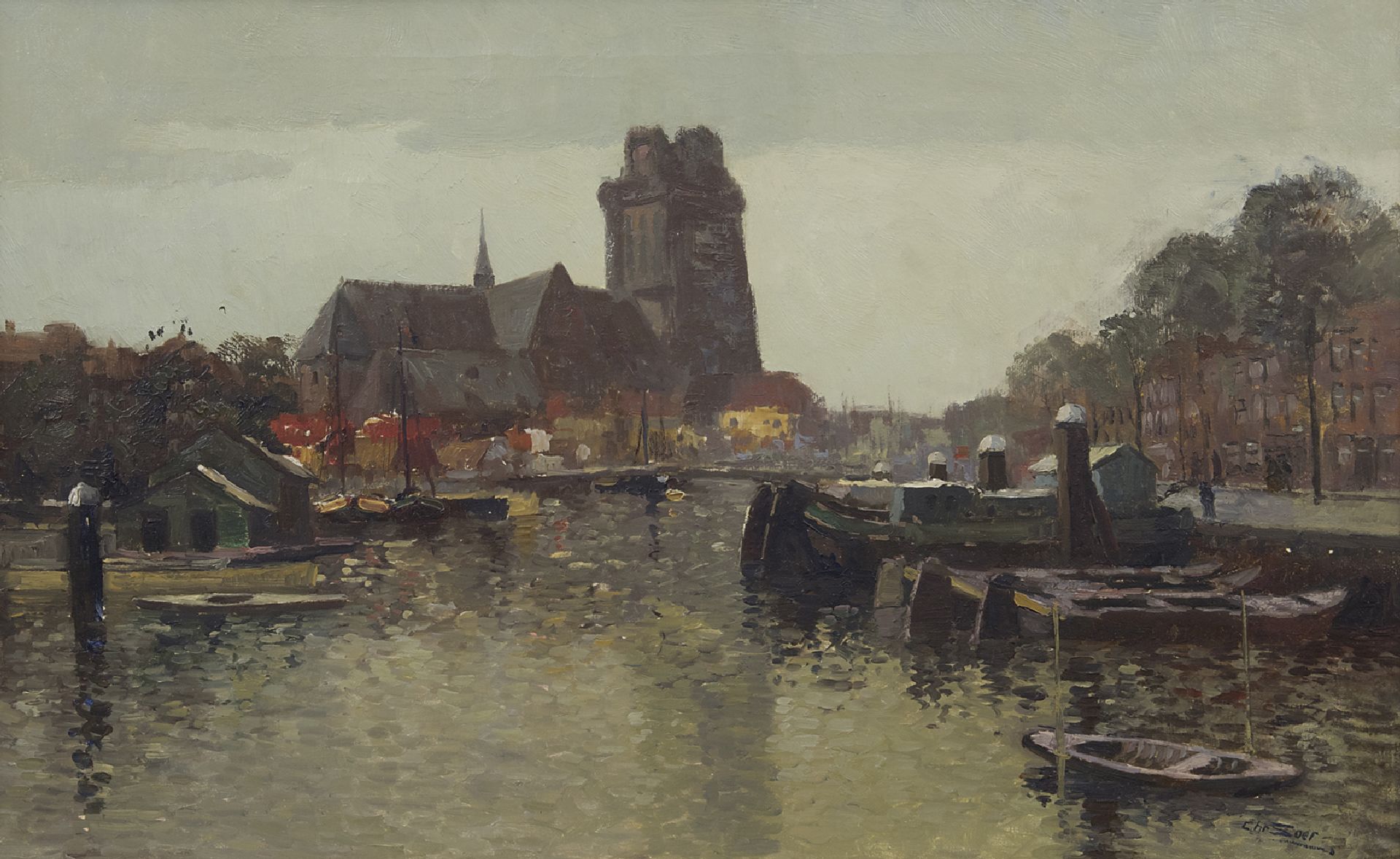 Chris Soer kunstwerk • schilderij • voorheen te koop De Nieuwe Haven met de Grote Kerk, Dordrecht
