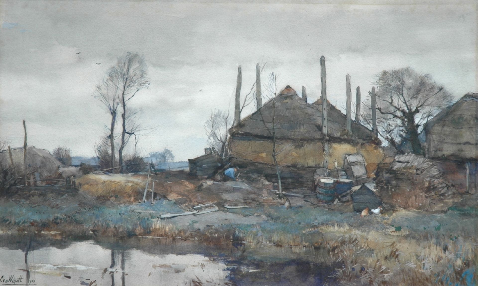 Chris van der Windt kunstwerk • aquarel • tekening • voorheen te koop Boerderij aan het water