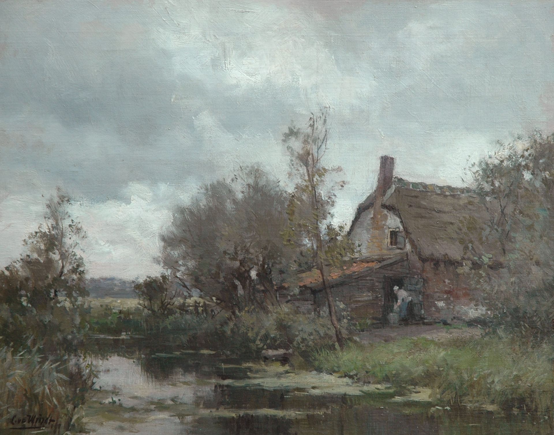 Het werk van de Leidse schilder Chris van der Windt is sterk verwant aan dat van de Haagse School. Hij werkte vaak 'en plein air' en meende dat ook de aquareltechniek zich er uitstekend voor leende om de typische atmosfeer van het Hollandse waterlandschap weer te geven. Zijn geliefde onderwerp was het 'intieme boerenerf': een 'close-up' van een hoekje van een boerenerf met een enkel figuurtje, drogend wasgoed of een oplichtend kapje als blikvanger. Ook schilderde hij dieren en stillevens in schitterende kleuren. Veel van zijn werk werd in Engeland en Canada verkocht.