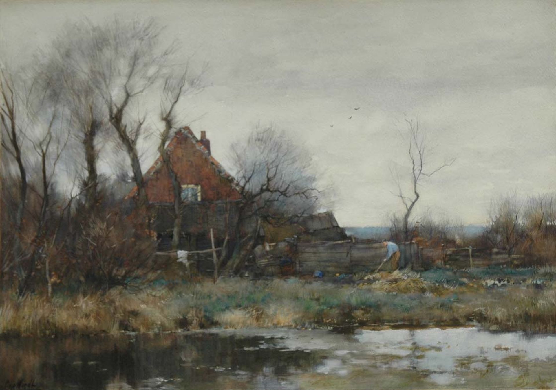 Chris van der Windt kunstwerk • aquarel • tekening • voorheen te koop Boerderij aan het water