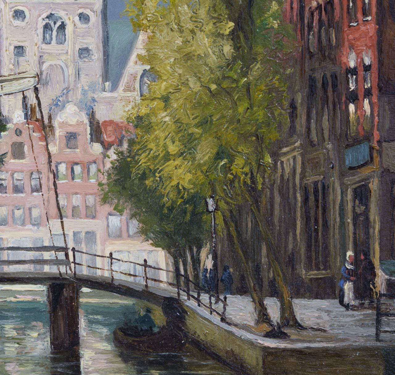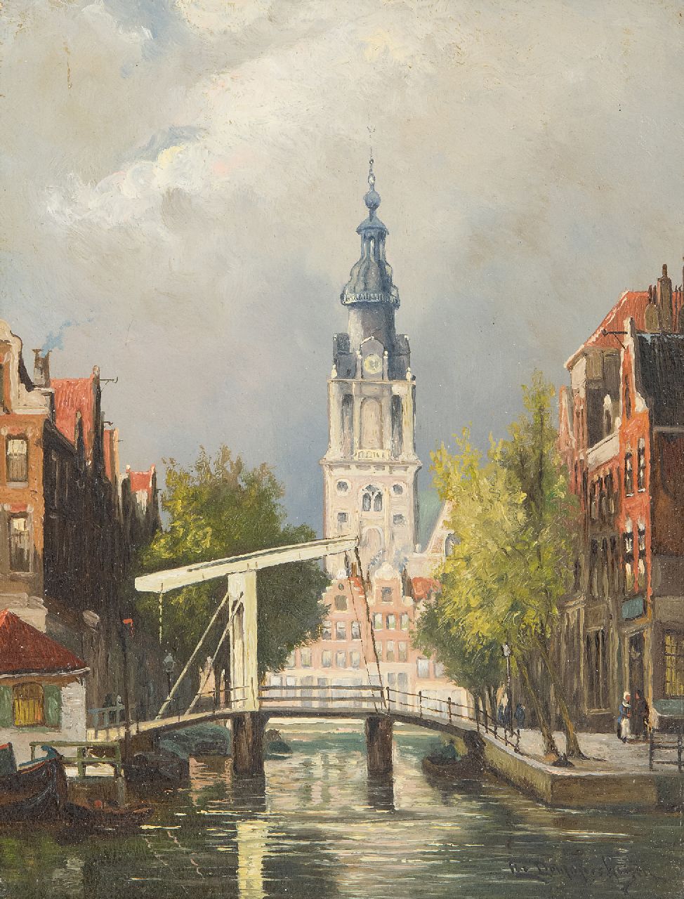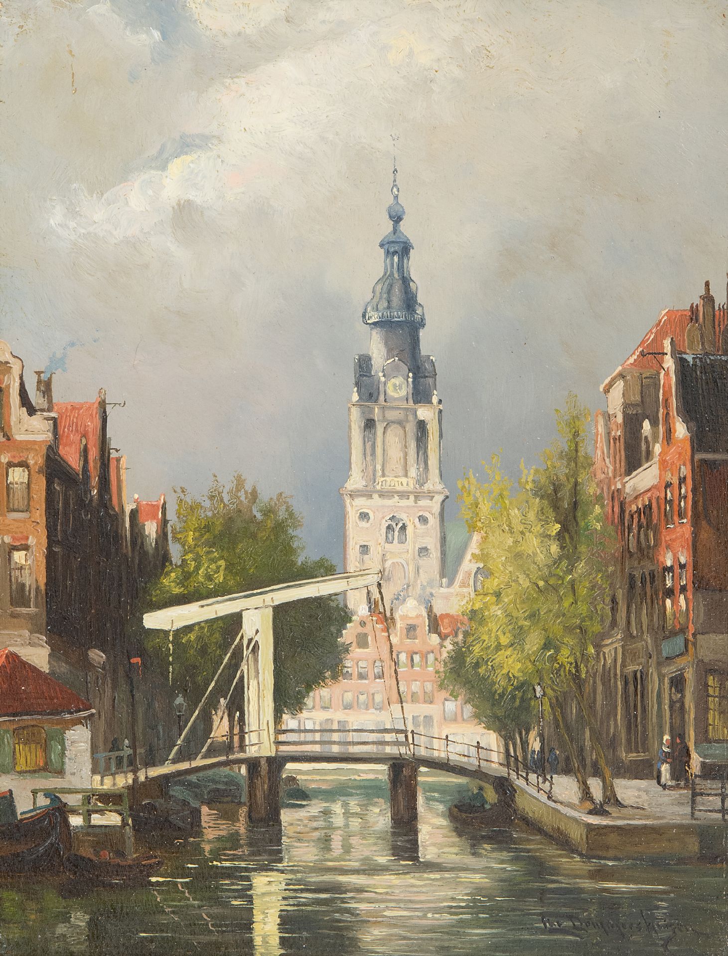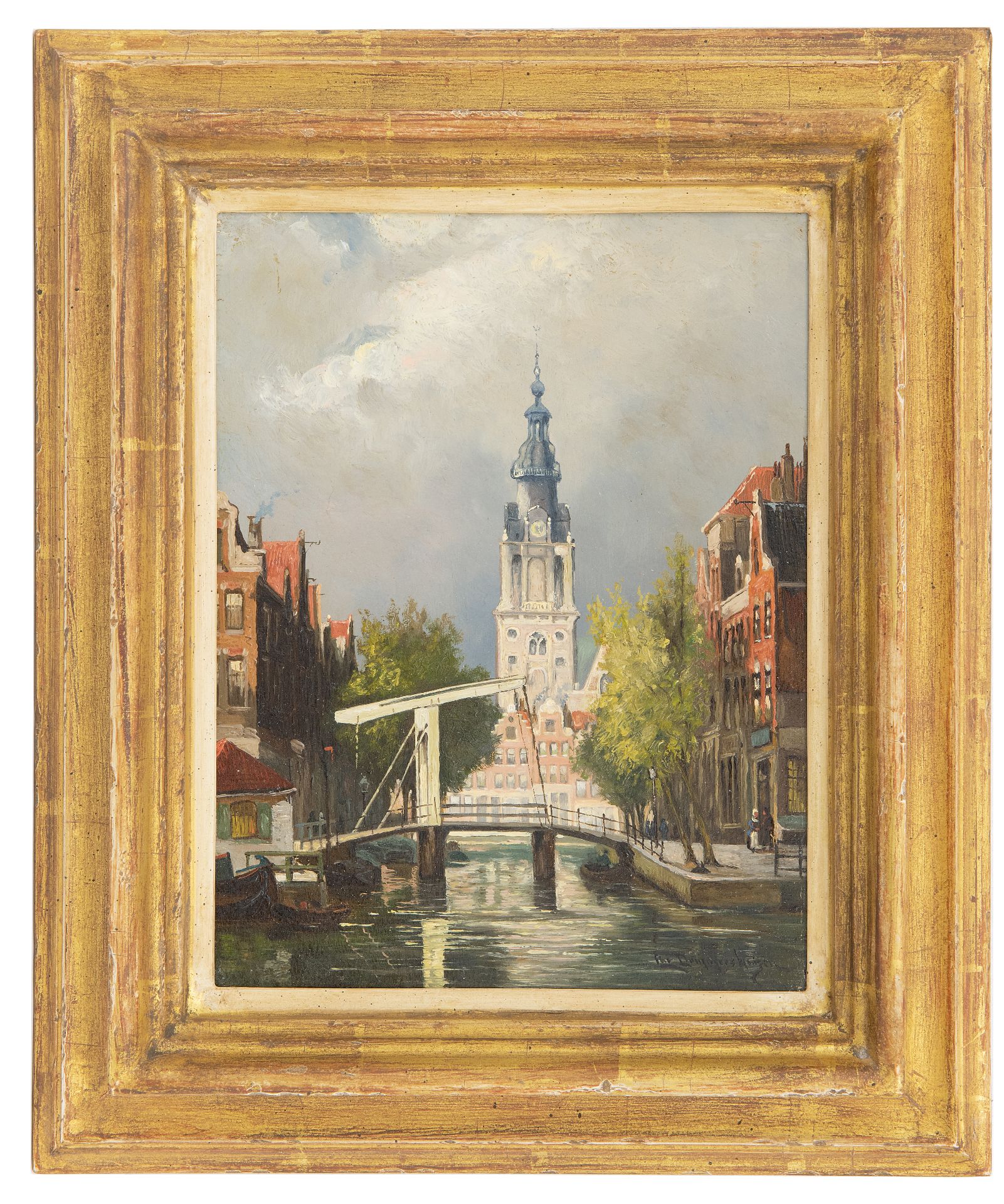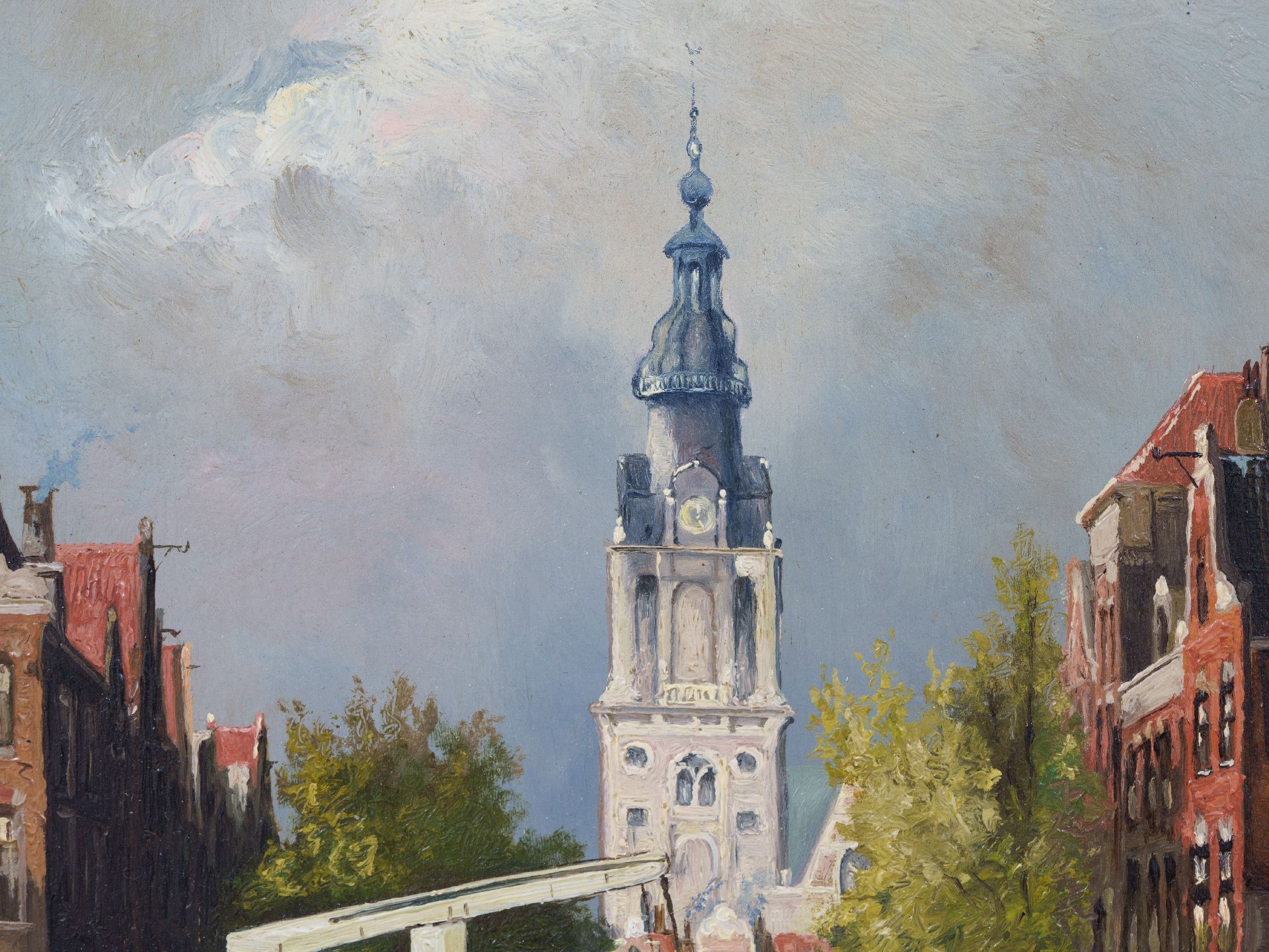 Christiaan Dommelshuizen kunstwerk • schilderij • voorheen te koop Amsterdams stadsgezicht met de Zuiderkerkstoren