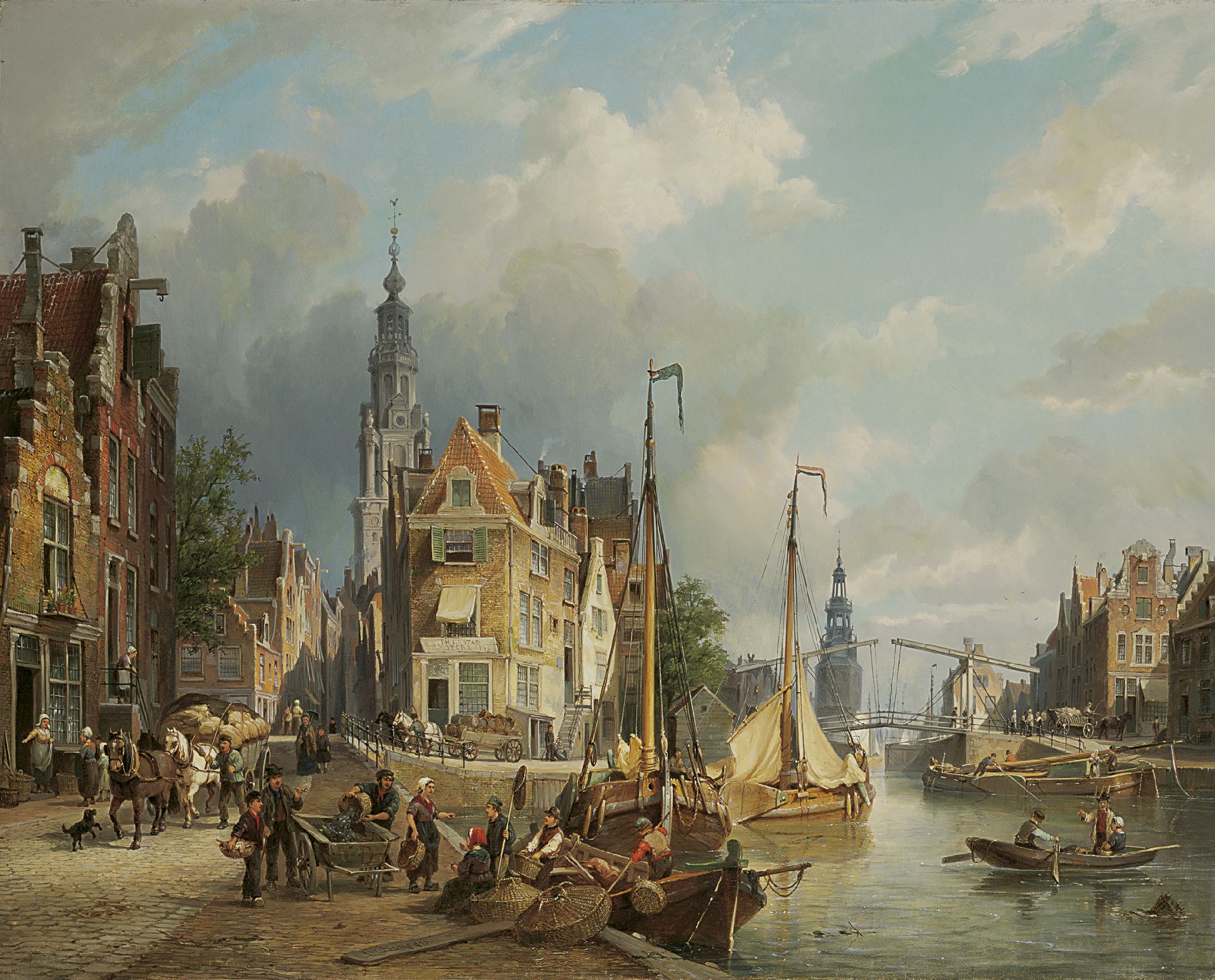 Christiaan Dommelshuizen kunstwerk • schilderij • voorheen te koop De Zwanenburgwal met de Montelbaanstoren in de verte, Amsterdam