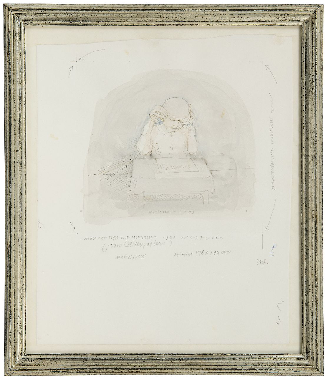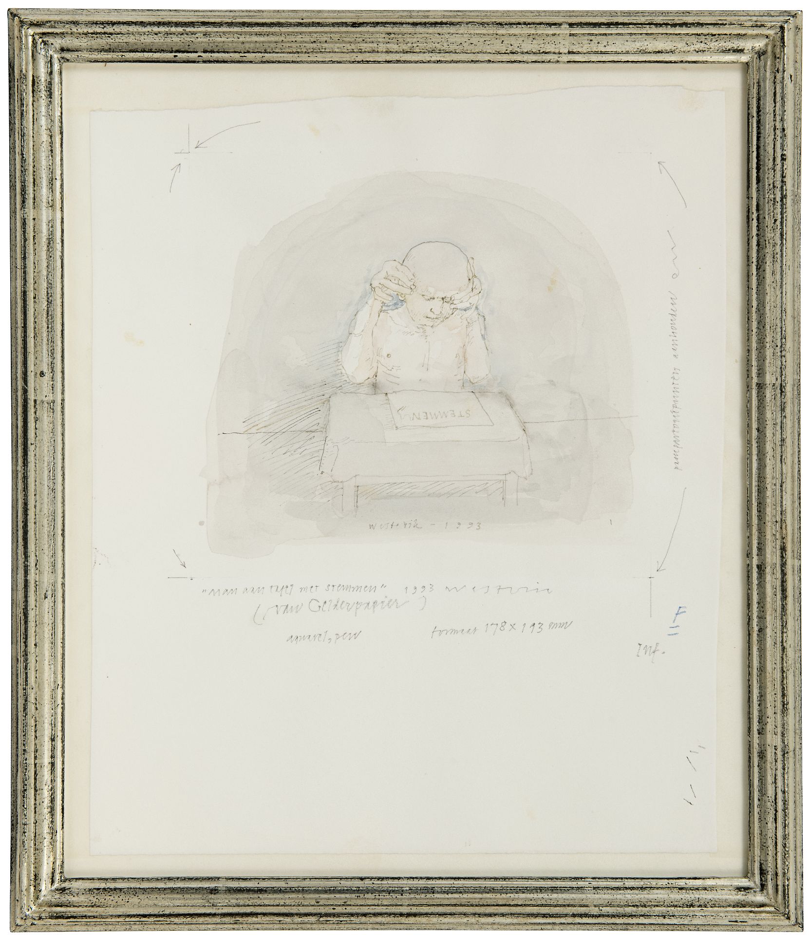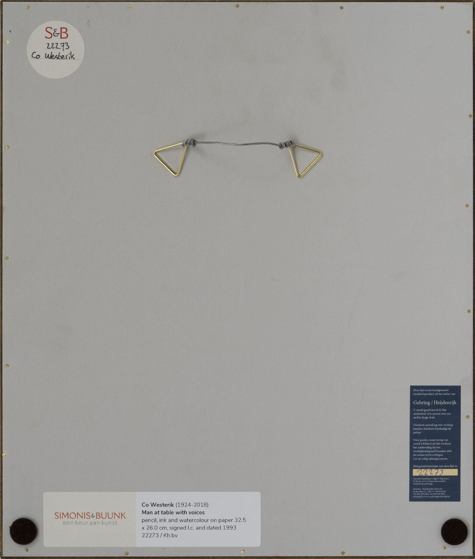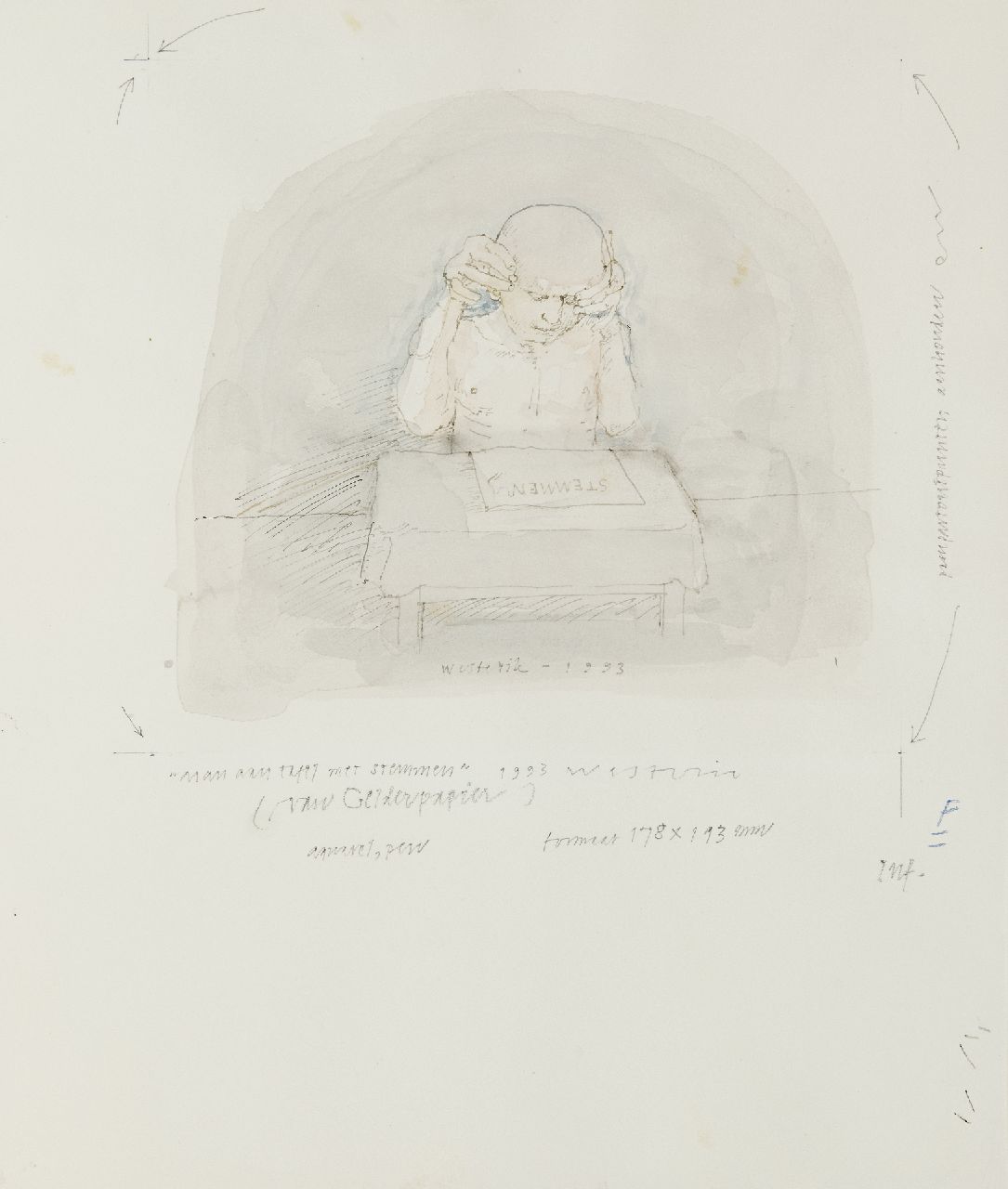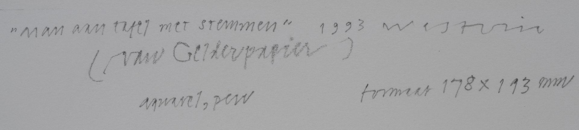 annotatie middenonder: ‘''man aan tafel met stemmen” 1993 Westerik, (van Gelderpapier), aquarel pen, formaat 178 x 113 mm'