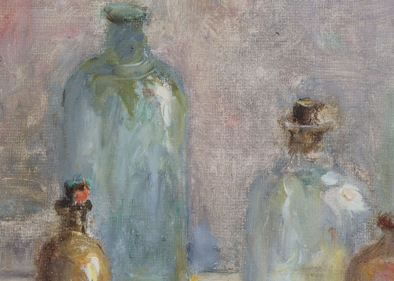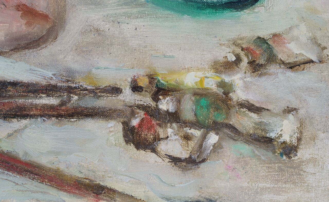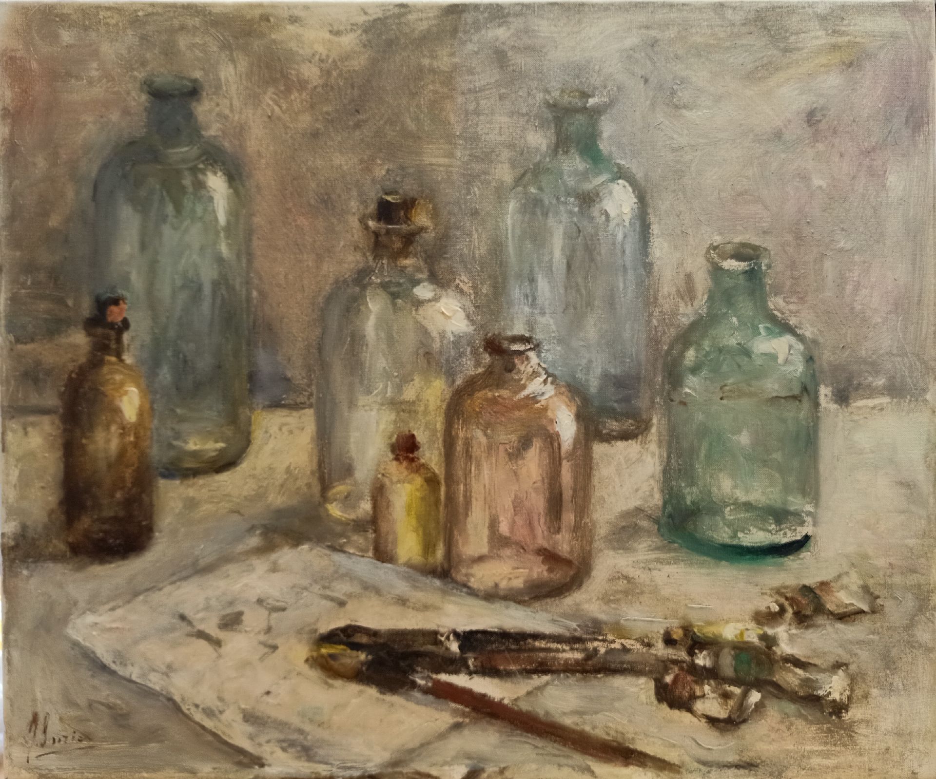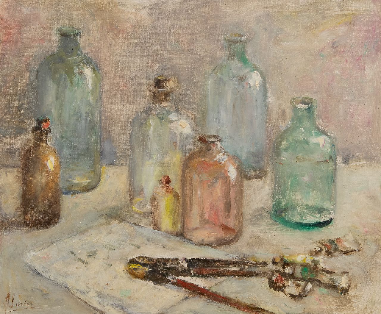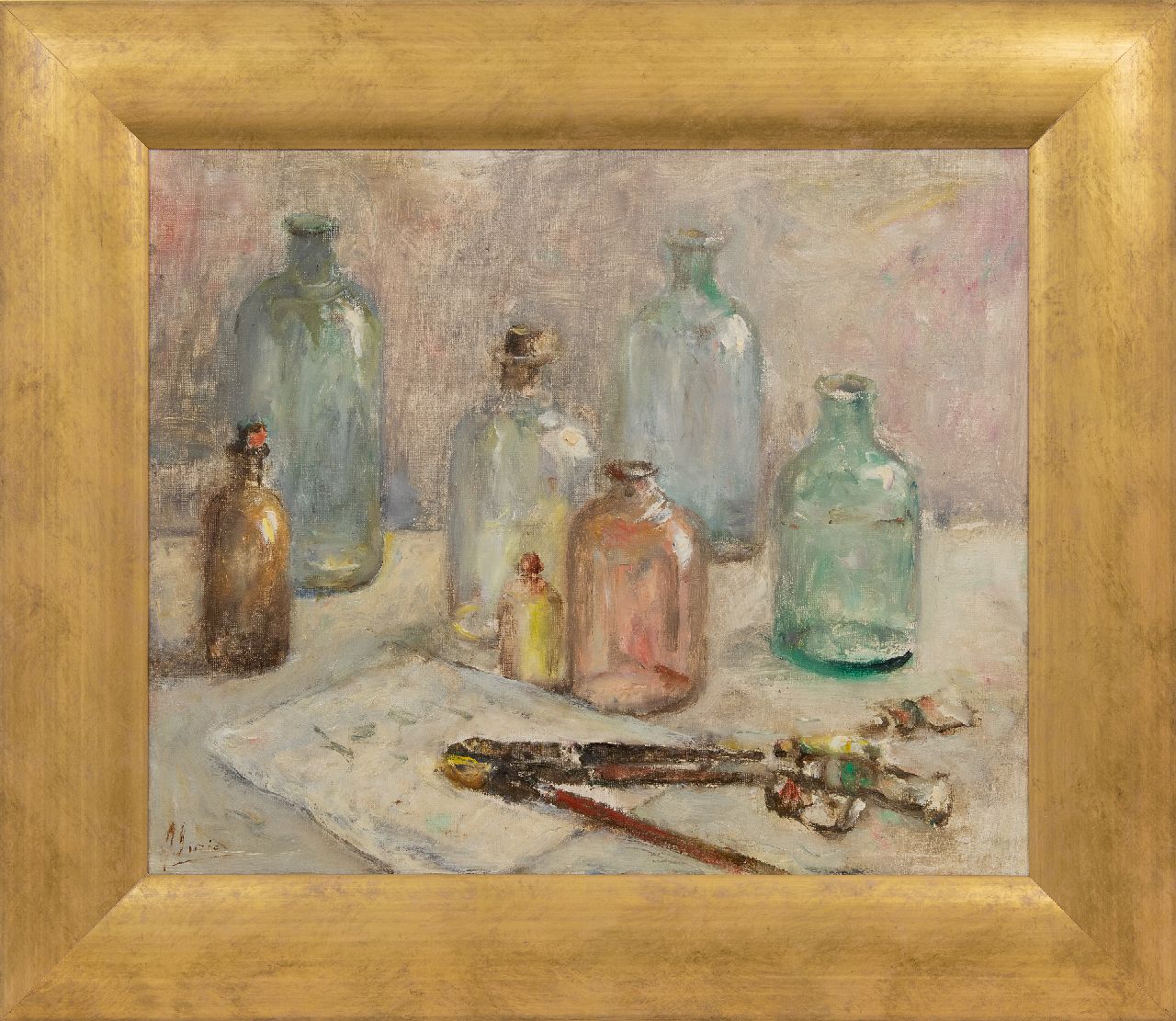 Coba Surie kunstwerk • schilderij • voorheen te koop Flessen en schildersattributen op een tafel