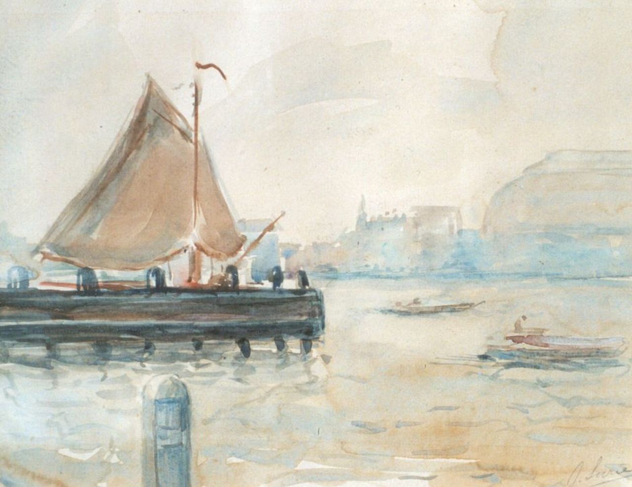 Coba Surie kunstwerk • aquarel • tekening • voorheen te koop Gezicht op het IJ bij Amsterdam met op de achtergrond het Centraal Station