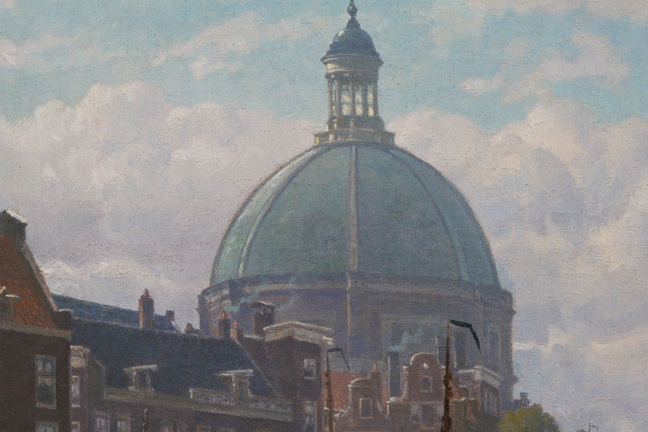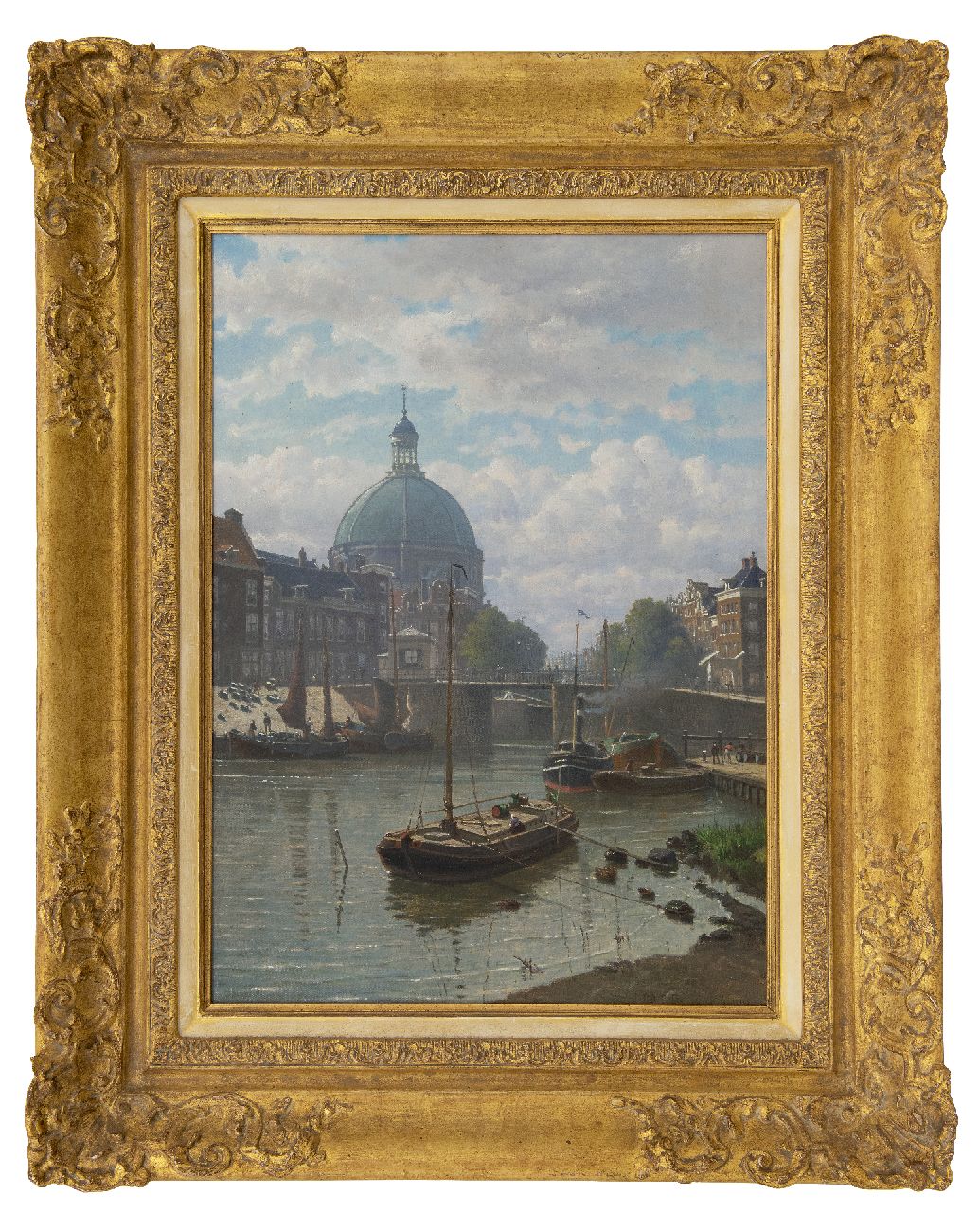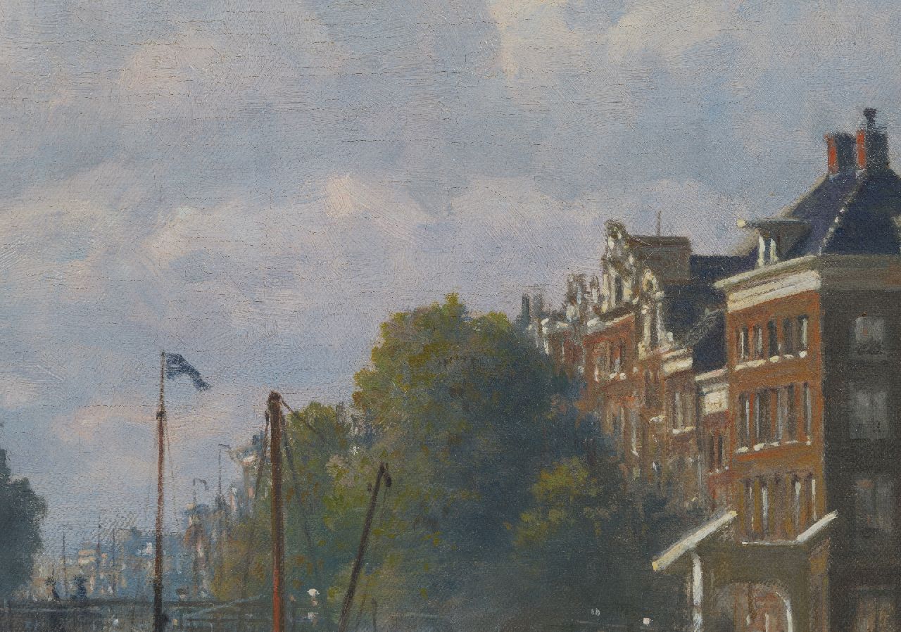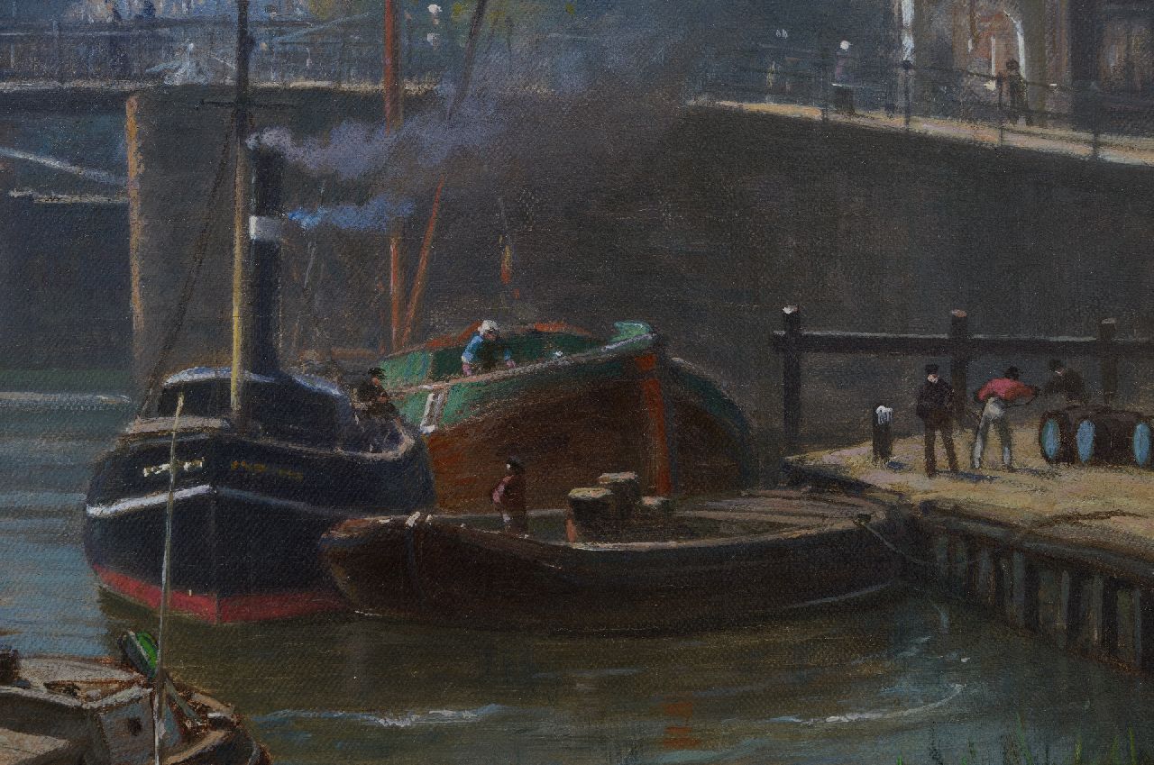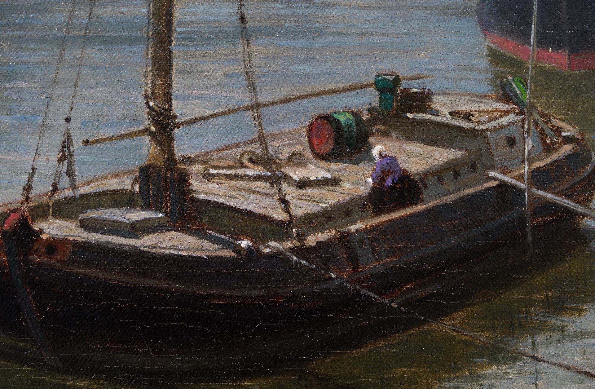 Coen Greive kunstwerk • schilderij • te koop Afgemeerde werkschepen voor de Amsterdamse Haarlemmersluis bij de Ronde Lutherse Kerk