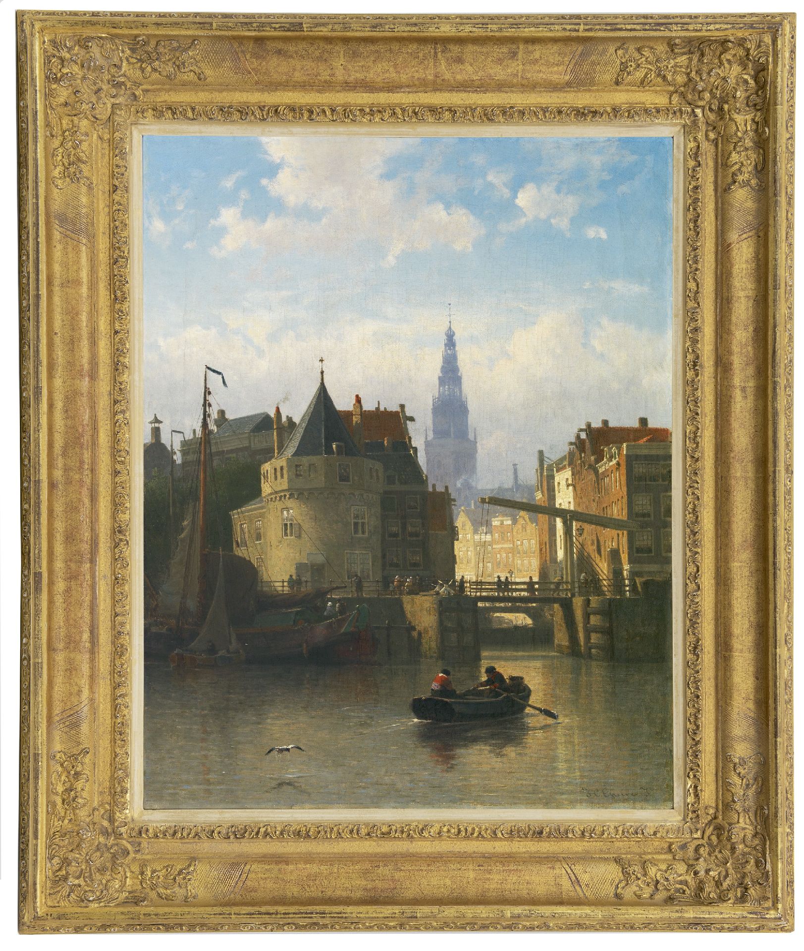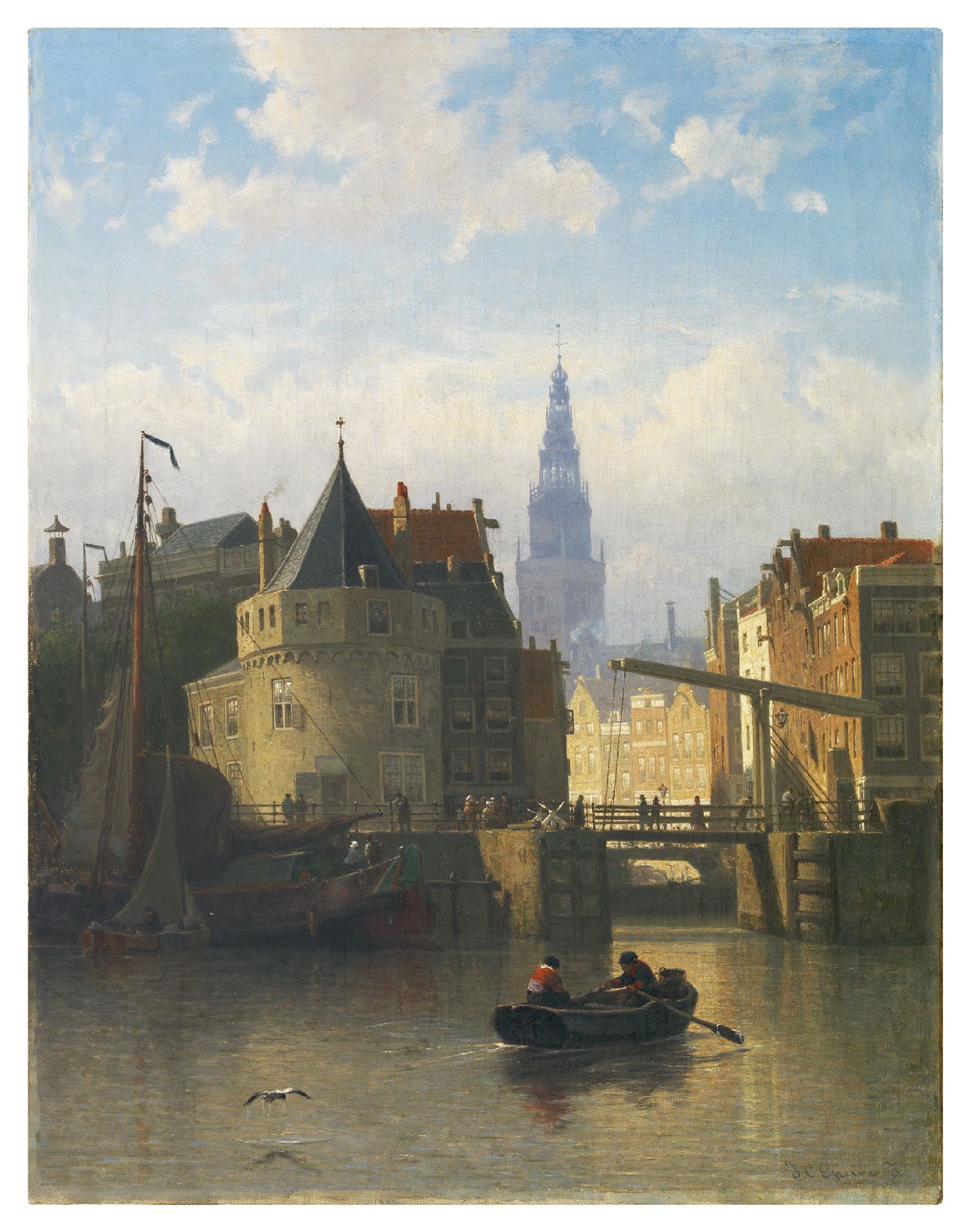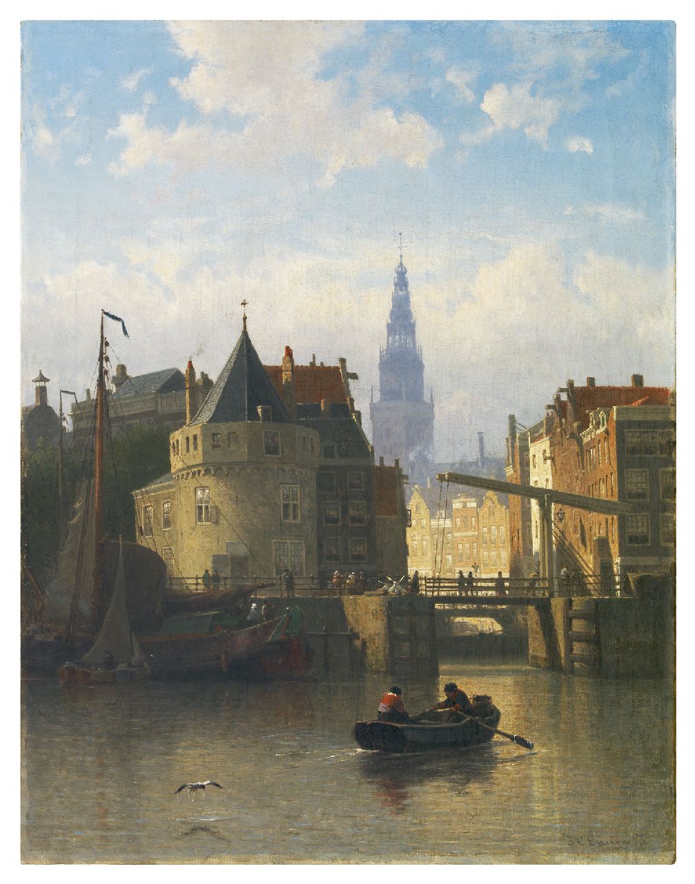 Coen Greive kunstwerk • schilderij • voorheen te koop Gezicht op de IJkant, Amsterdam, met de Schreierstoren