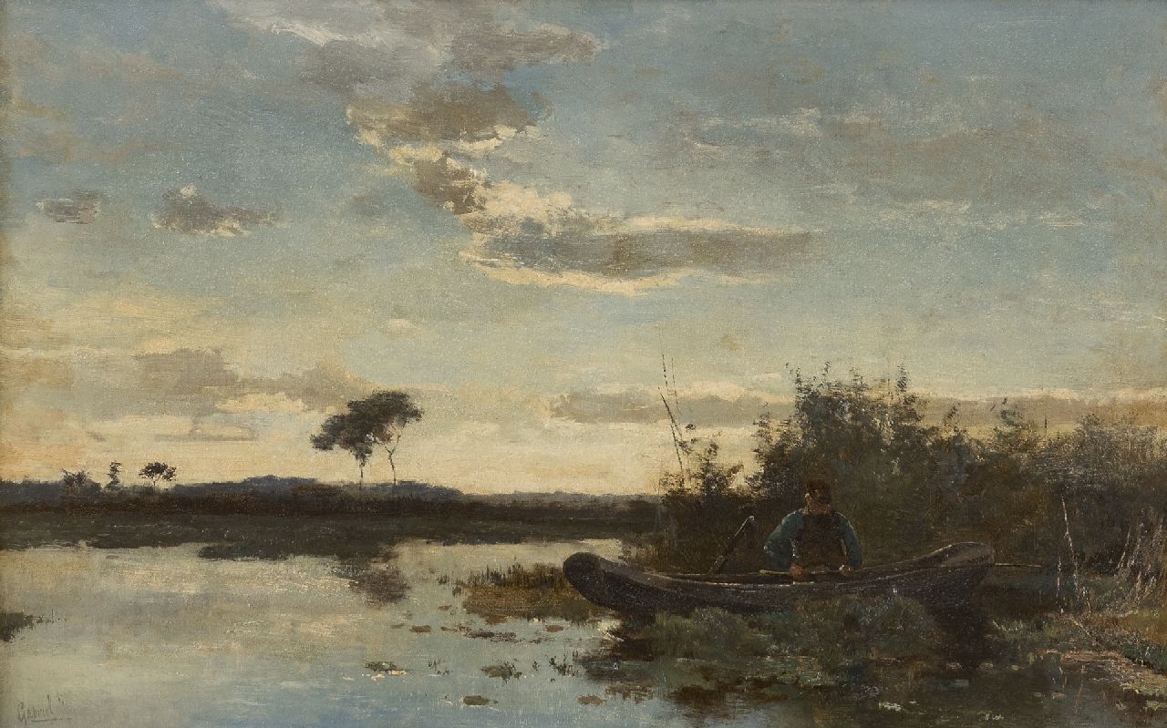 Constan Gabriel kunstwerk • schilderij • voorheen te koop Hengelaar in een roeiboot bij zonsondergang