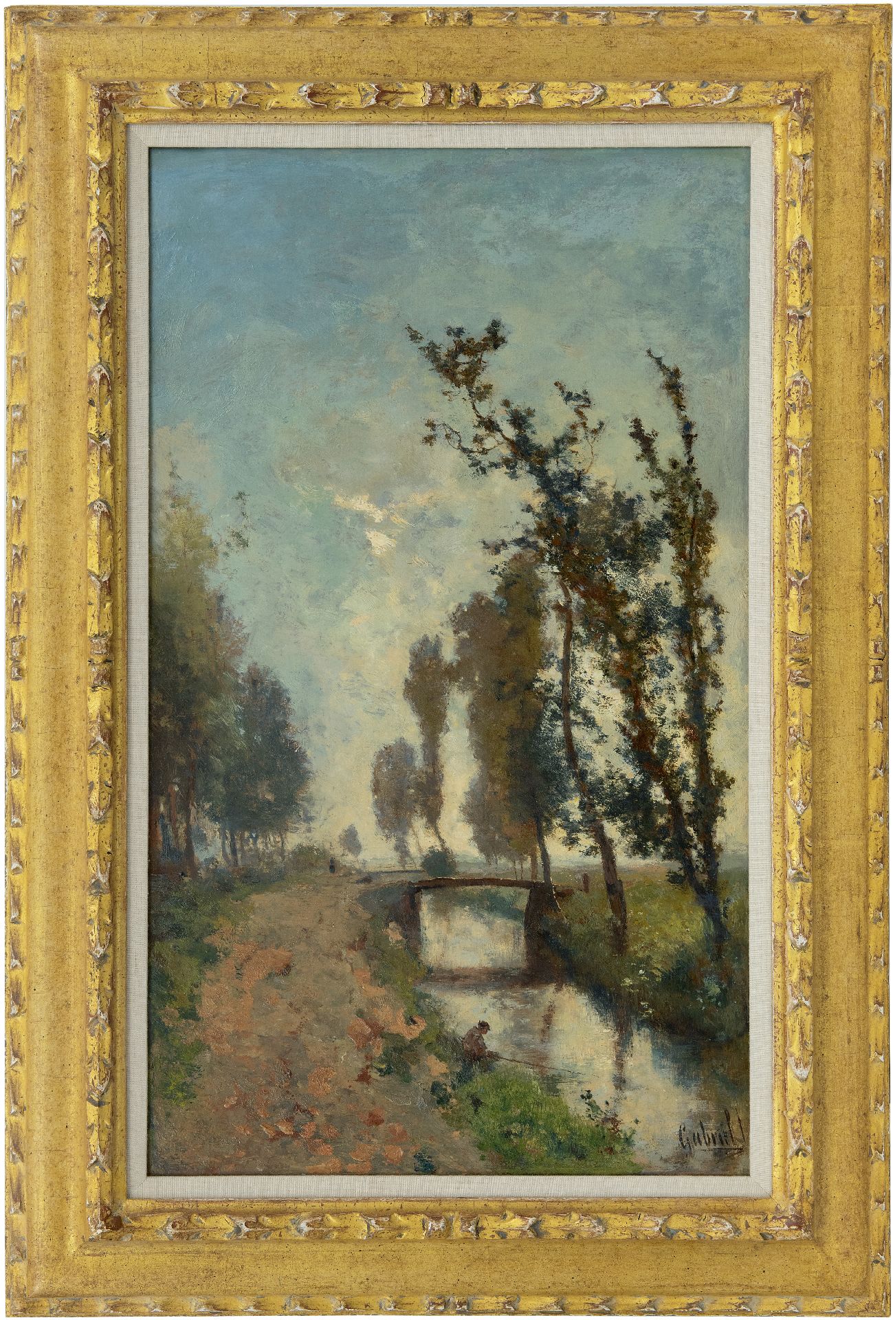 De natuur ontwaakt. In de atmosfeer ligt de belofte van een warme zomerdag besloten. De zon probeert de laatste wolkenflarden en morgennevels te verdrijven, al gauw zal de serene stemming van de vroege zomerochtend opgaan in haar stralende licht. Bomen, met het gebladerte nog niet door het zonlicht aangeraakt, spiegelen zich in een beekje, waarlangs op een zandpad een vroege reiziger zijns weegs gaat. Aan de waterkant zit een visser boven zijn hengel te mijmeren, nog even genietend van de rust. Dit schilderij doet begrijpen waarom de Haagse School-schilder P.J.C. Gabriël zichzelf een ‘harmonist’ noemde, altijd zoekend naar de juiste toon in zijn landschappen, aansluitend bij het waargenomen natuurmoment. Gabriël schilderde aanvankelijk ideale landschappen, zoals hij in de romantische schilderschool van B.C. Koekkoek had geleerd (zie pag. 11). Hoewel hij slechts een jaar bij Koekkoek bleef omdat hij er niet kon aarden, koesterde hij levenslang diens credo ‘de natuur als leermeester’. Wel gaf hij er een andere invulling aan: in tegenstelling tot Koekkoek schilderde Gabriël in zijn atelier de natuur zoals deze hem buiten voorkwam. Anders dan van zijn romantische leermeester ondervond Gabriël veel steun van Willem Roelofs. Met diens aanwijzingen ontwikkelde hij zich tot een succesvol landschapschilder, met een helder palet en een lyrische weergave van de directe impressie.