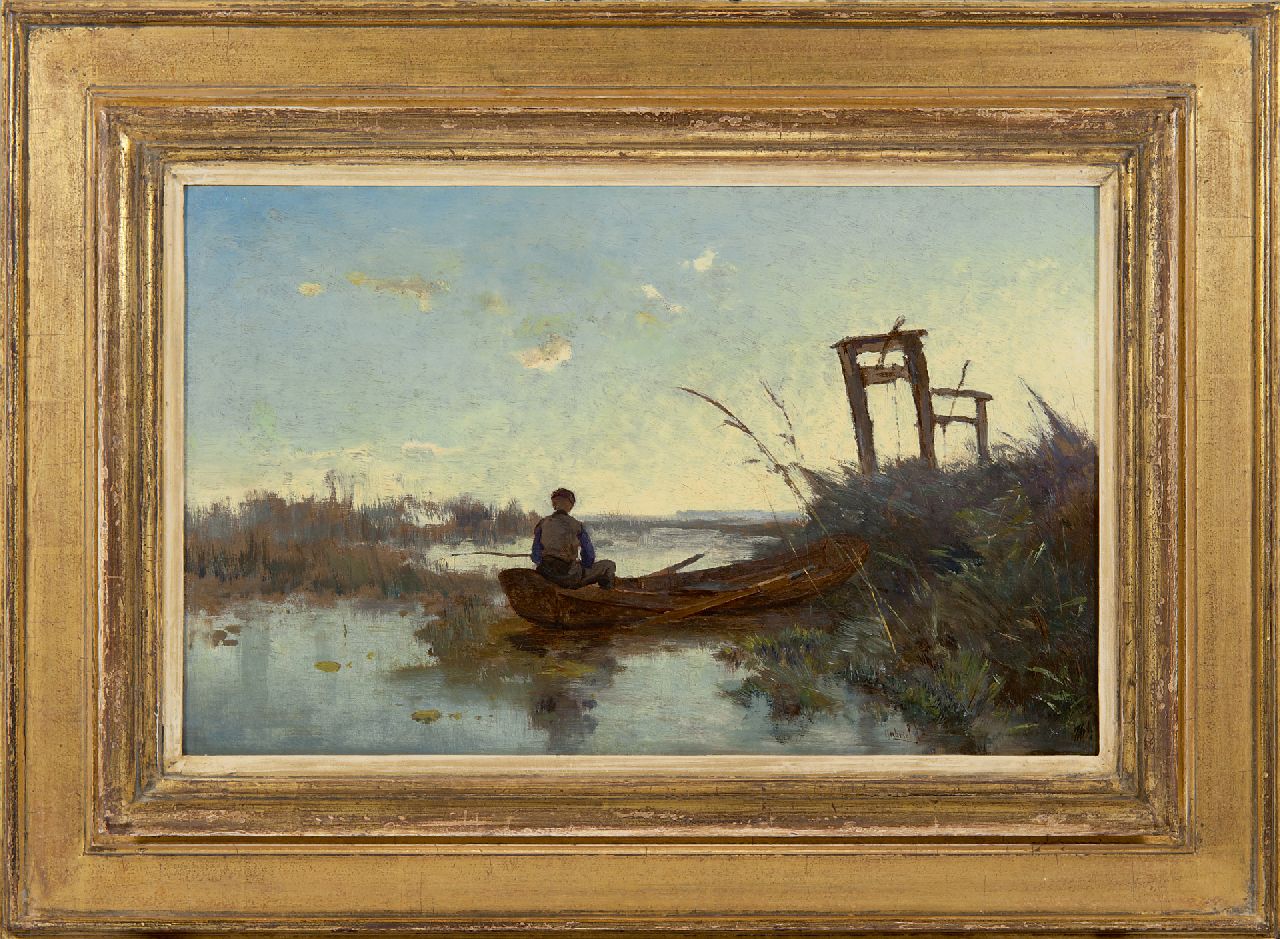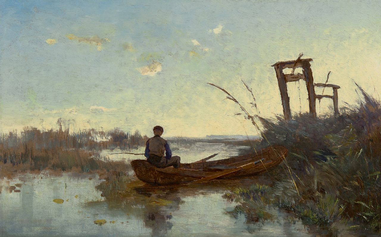 Constan Gabriel kunstwerk • schilderij • voorheen te koop Visser bij viskaar in veenlandschap