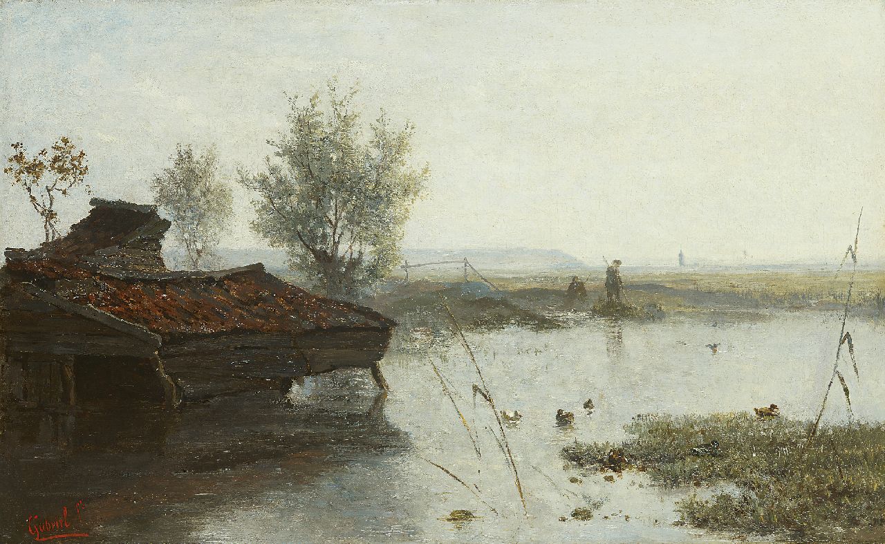 Constan Gabriel kunstwerk • schilderij • voorheen te koop Vissers bij een poldersloot met schuitenhuis