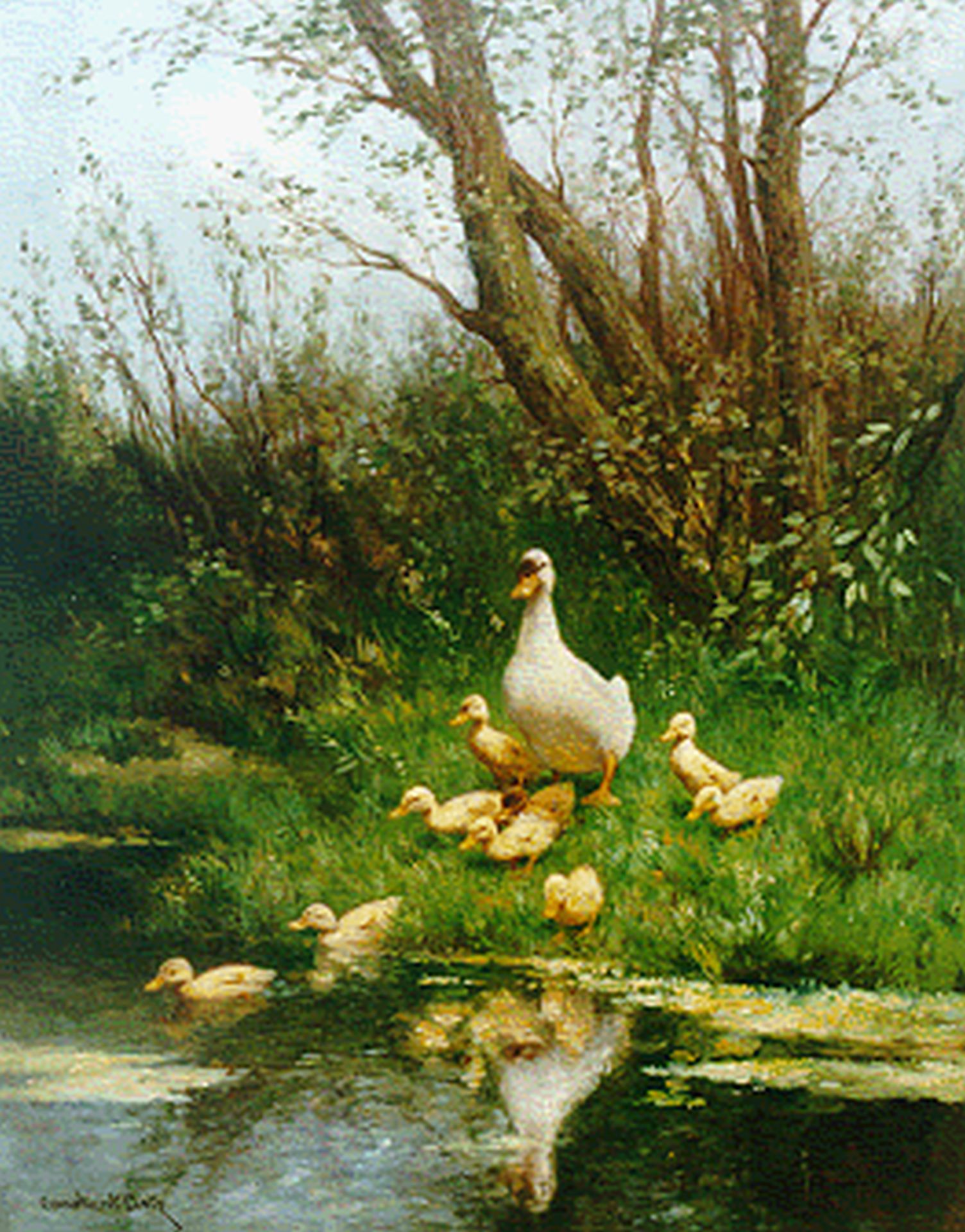 Constant Artz kunstwerk • schilderij • voorheen te koop Eend met kuikens op de rivieroever
