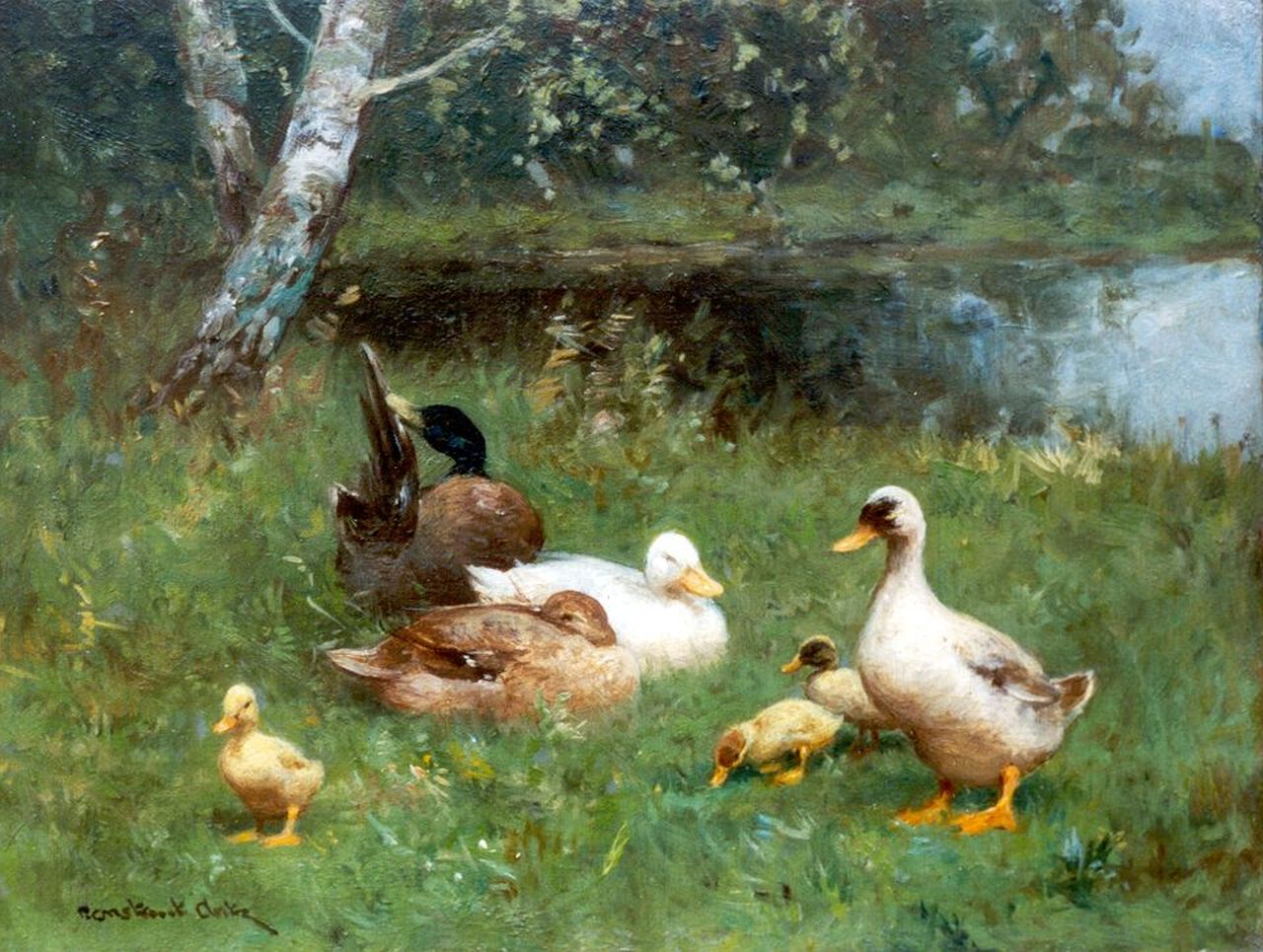 Constant Artz kunstwerk • schilderij • voorheen te koop Eenden en kuikens op een rivieroever