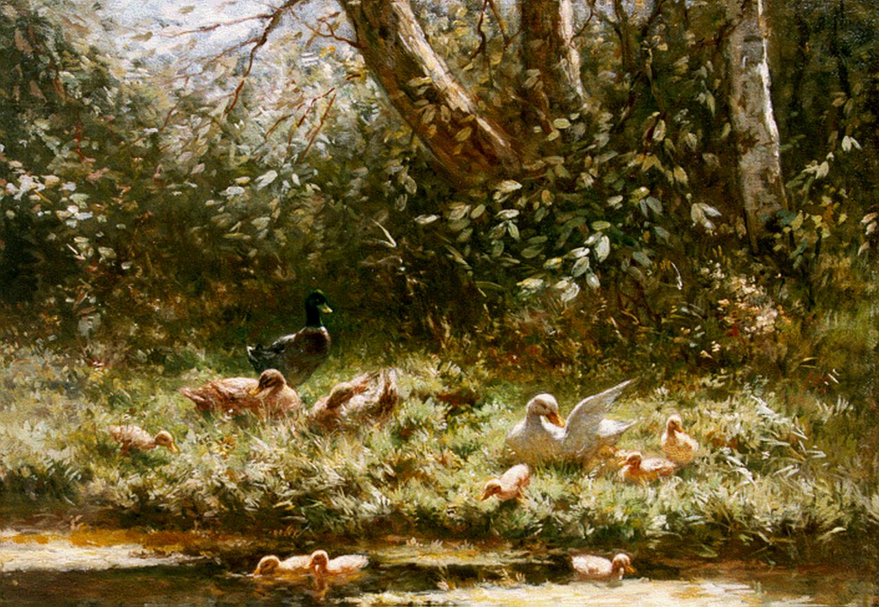 Constant Artz kunstwerk • schilderij • voorheen te koop Eenden met kuikens op zonovergoten rivieroever