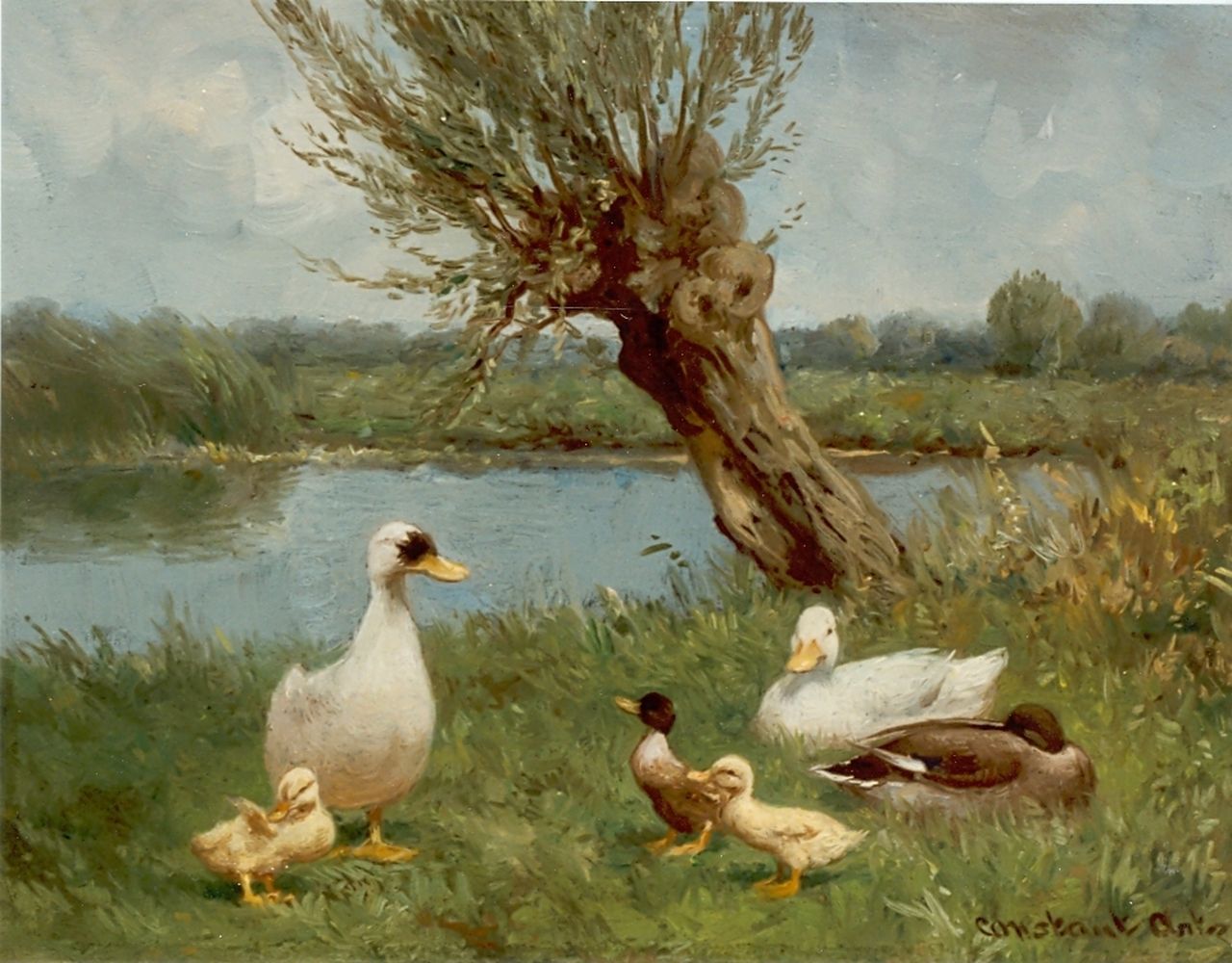 Constant Artz | Eendenfamilie bij een vijver, olieverf op paneel, 50,1 x 40,2 cm, gesigneerd l.o. en zonder lijst