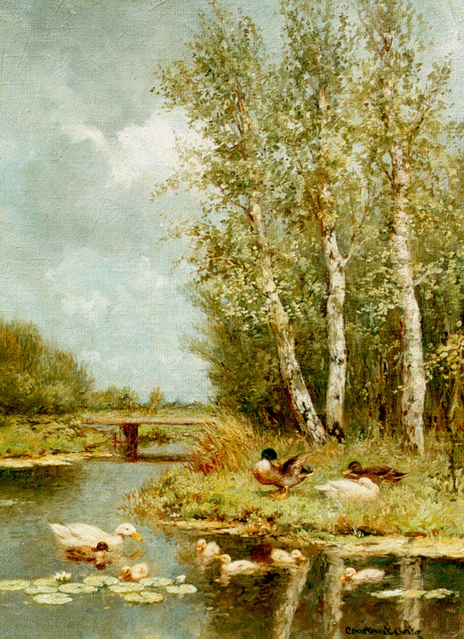 Constant Artz kunstwerk • schilderij • voorheen te koop Eendenfamilie bij berkenbomen