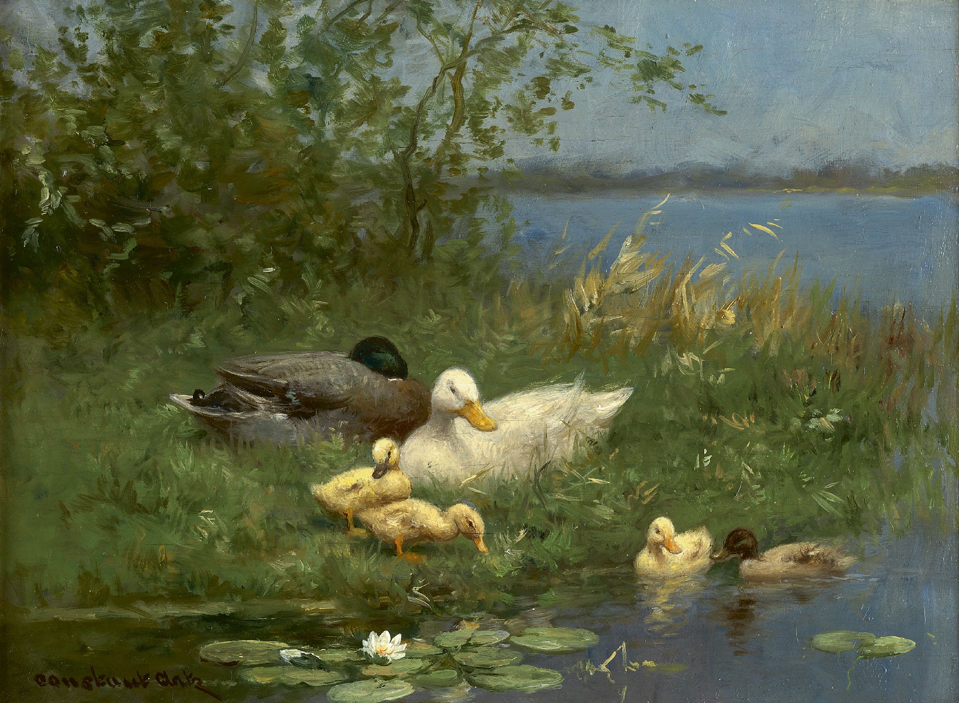 Constant Artz kunstwerk • schilderij • voorheen te koop Eendenfamilie langs de waterkant