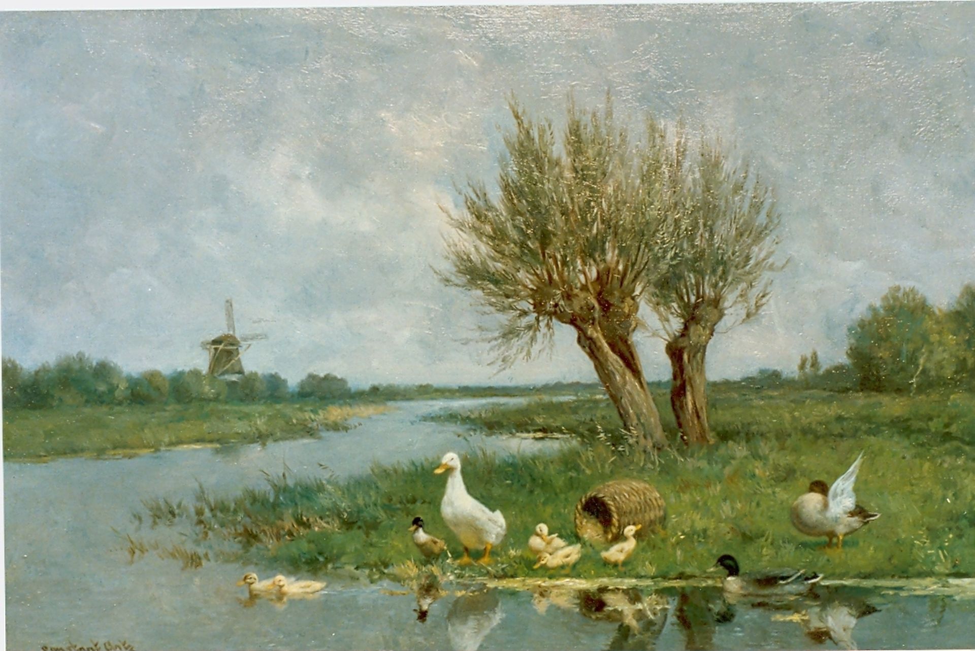 Constant Artz kunstwerk • schilderij • voorheen te koop Eendjes aan de slootkant met een molen