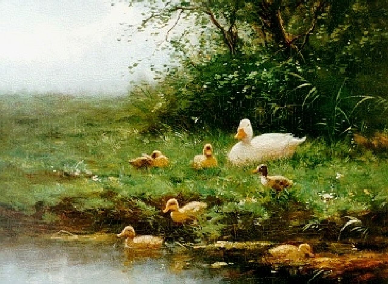 Constant Artz kunstwerk • schilderij • voorheen te koop Moedereend en kuikens aan de slootkant