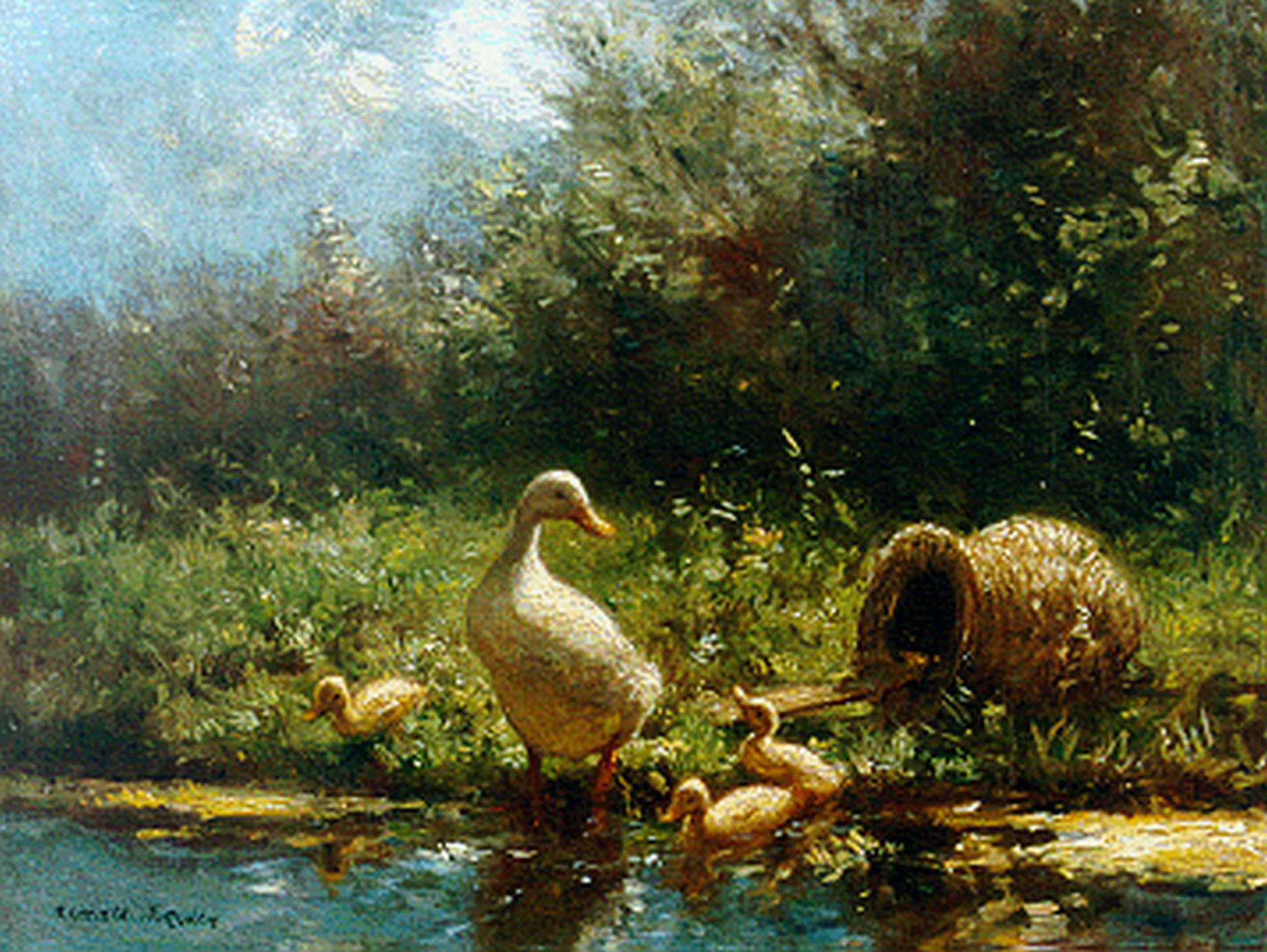 Constant Artz kunstwerk • schilderij • voorheen te koop Moedereend met drie kuikens bij broedkorf