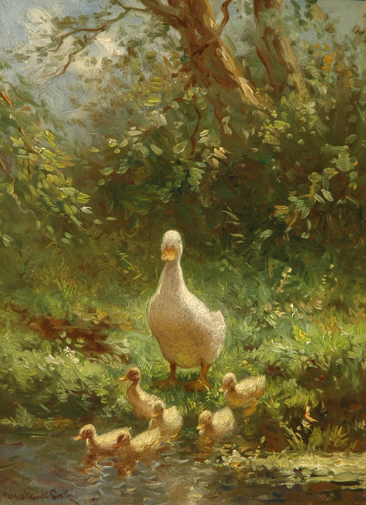 Constant Artz kunstwerk • schilderij • voorheen te koop Moedereend met zes kuikens aan de waterrand