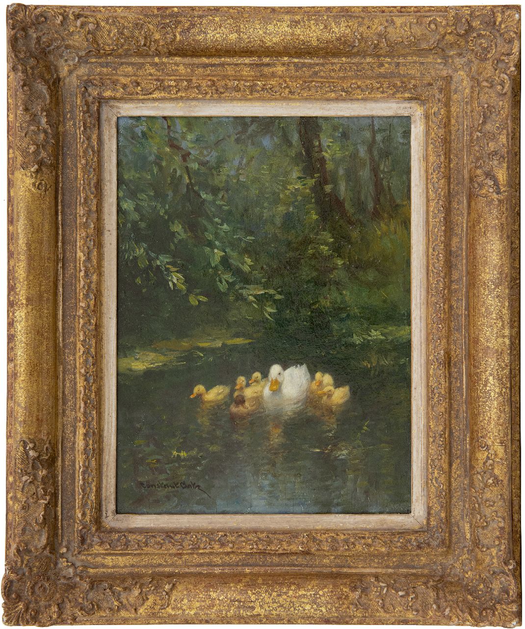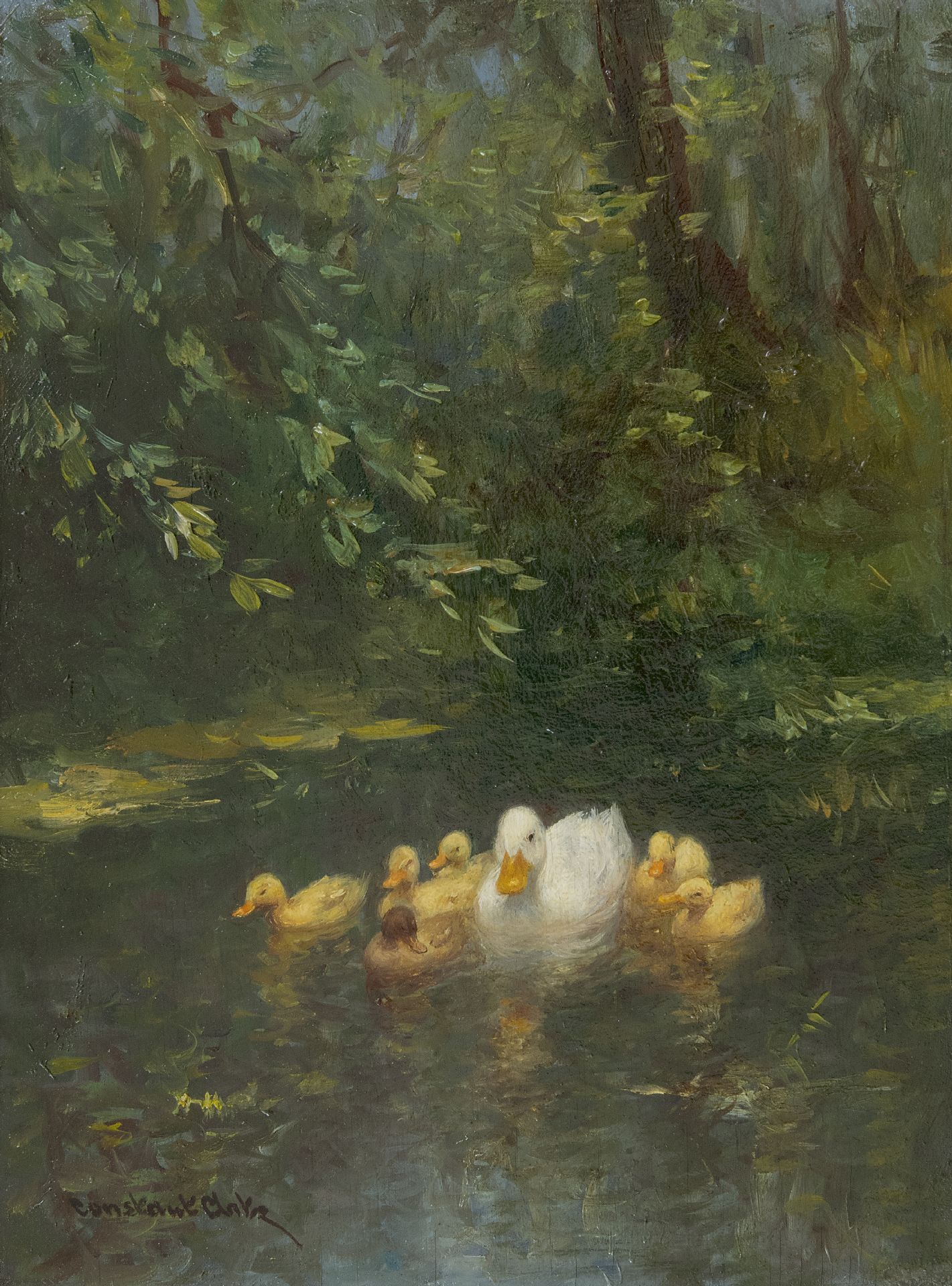 Constant Artz kunstwerk • schilderij • voorheen te koop Moedereend met zes kuikens in het water