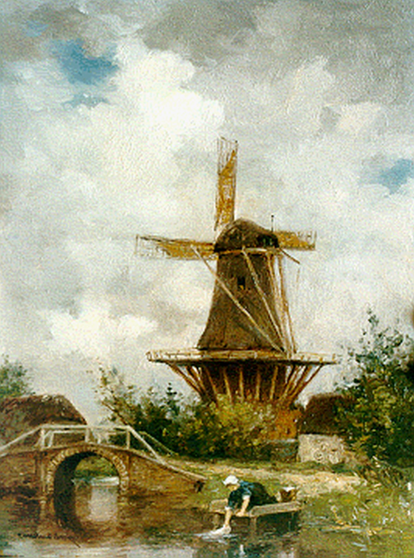 Constant Artz kunstwerk • schilderij • voorheen te koop Molenlandschap met wassende vrouw bij een rivier