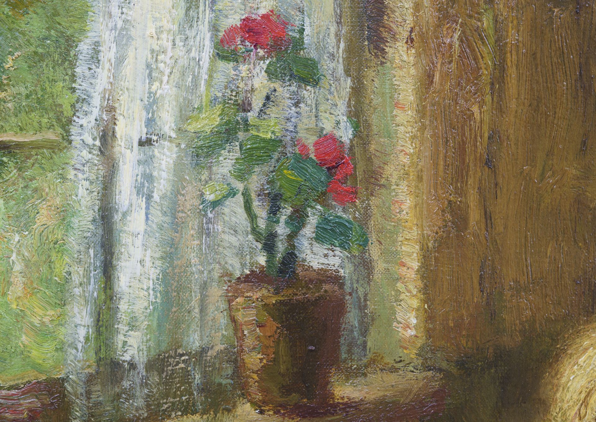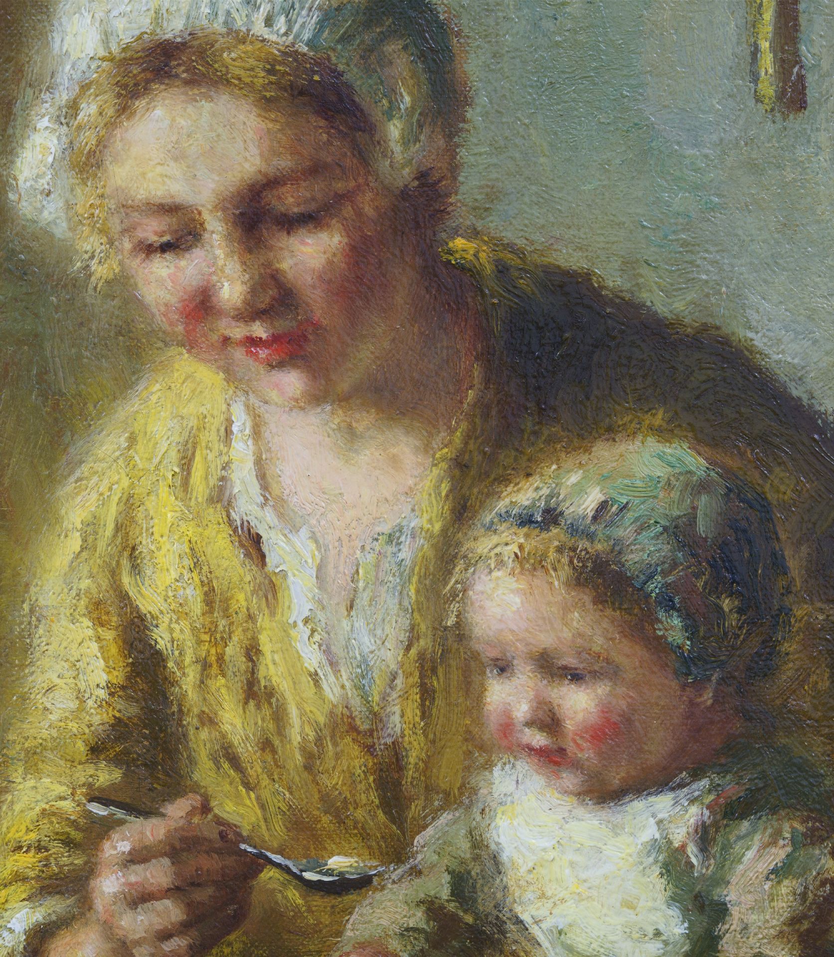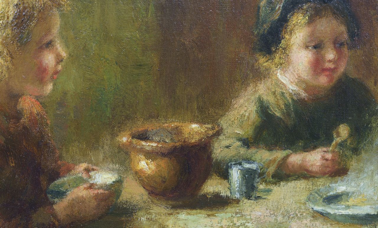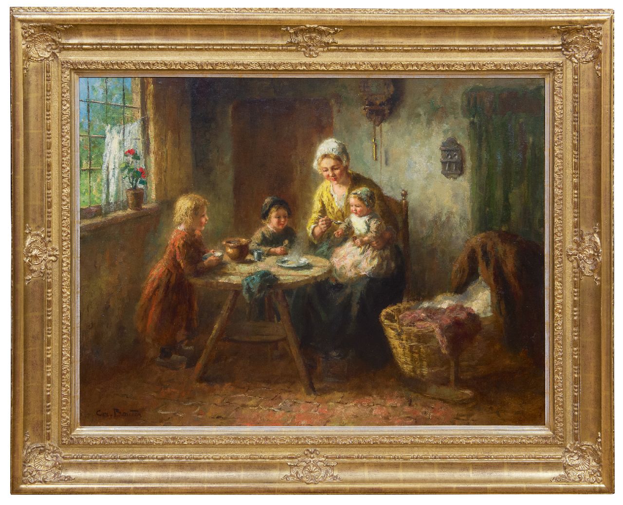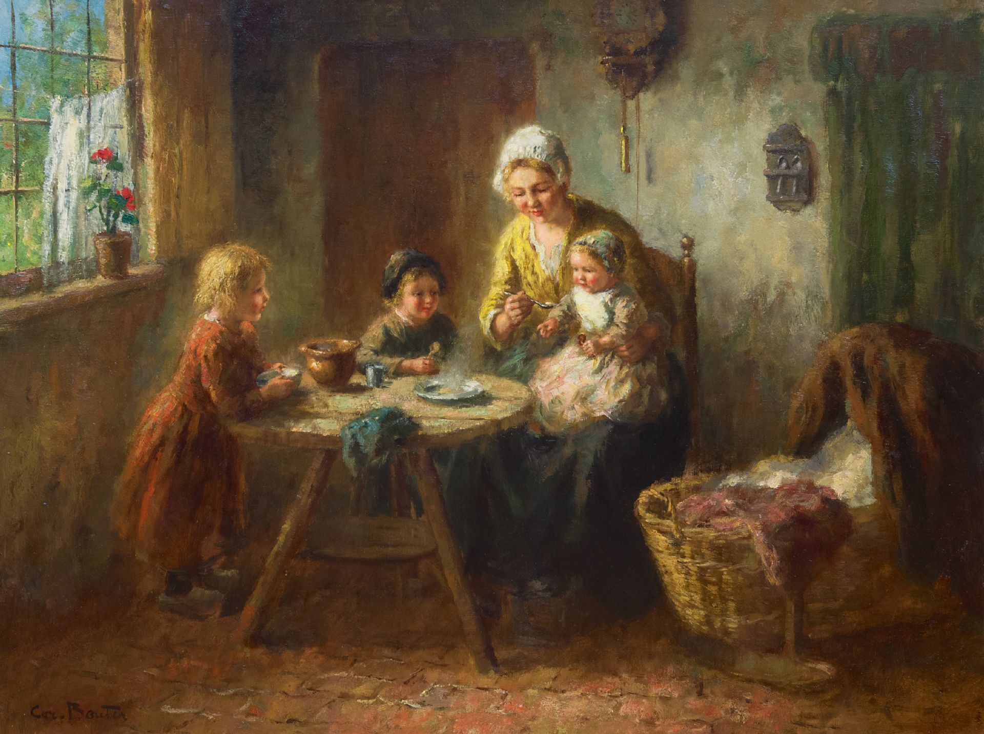 Cor Bouter kunstwerk • schilderij • voorheen te koop Interieur met moeder en kinderen aan de maaltijd