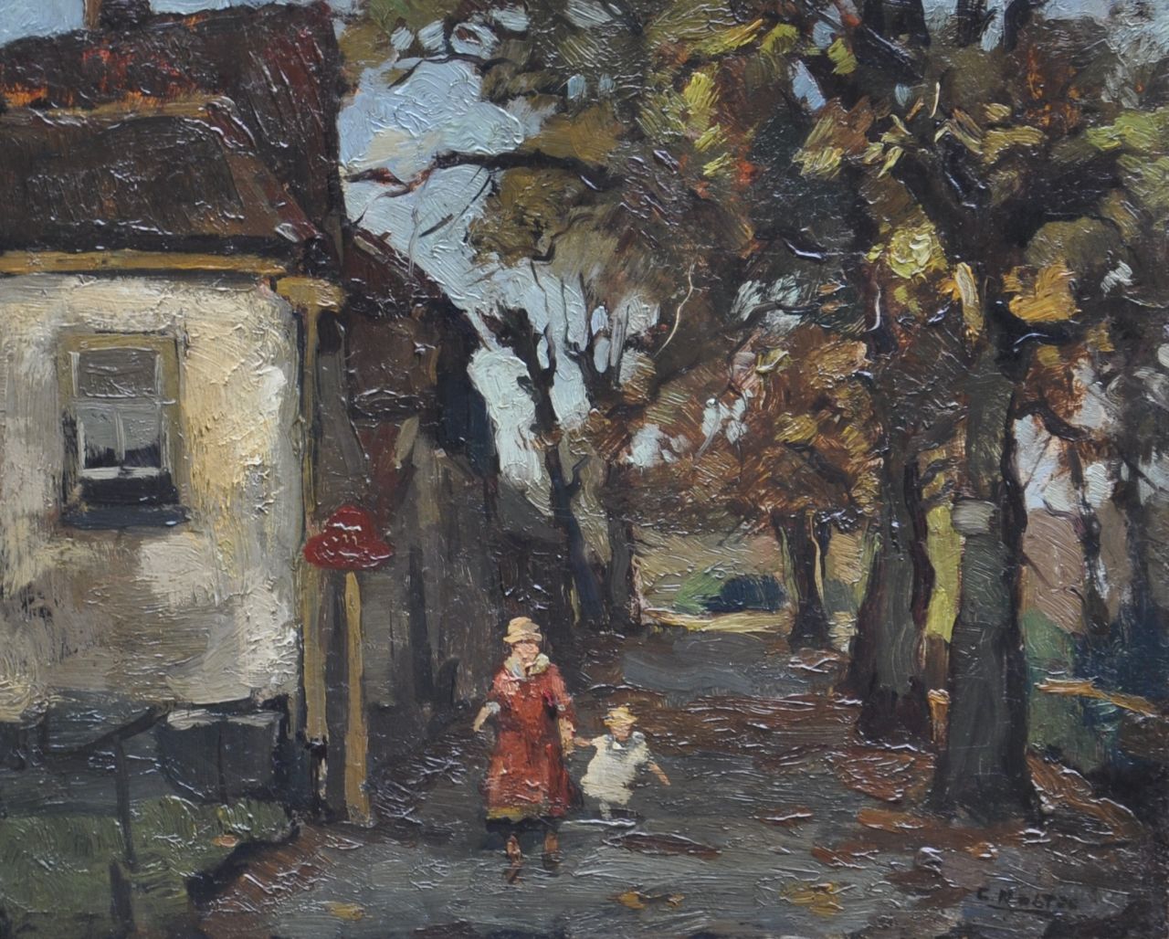 Cor Noltee kunstwerk • schilderij • voorheen te koop Dorpslaantje met moeder en kind