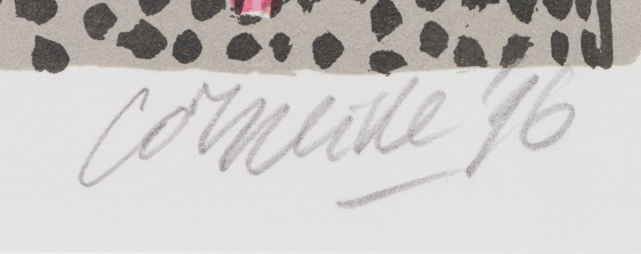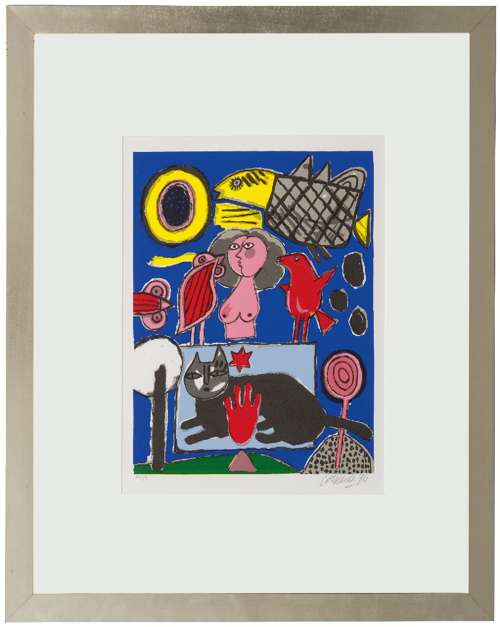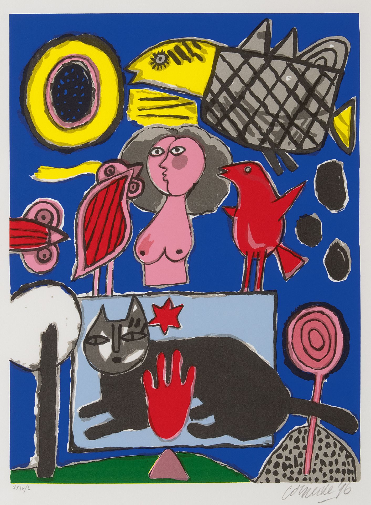 Corneille kunstwerk • grafiek • te koop Compositie met zwarte kat, roze vrouw en vogels
