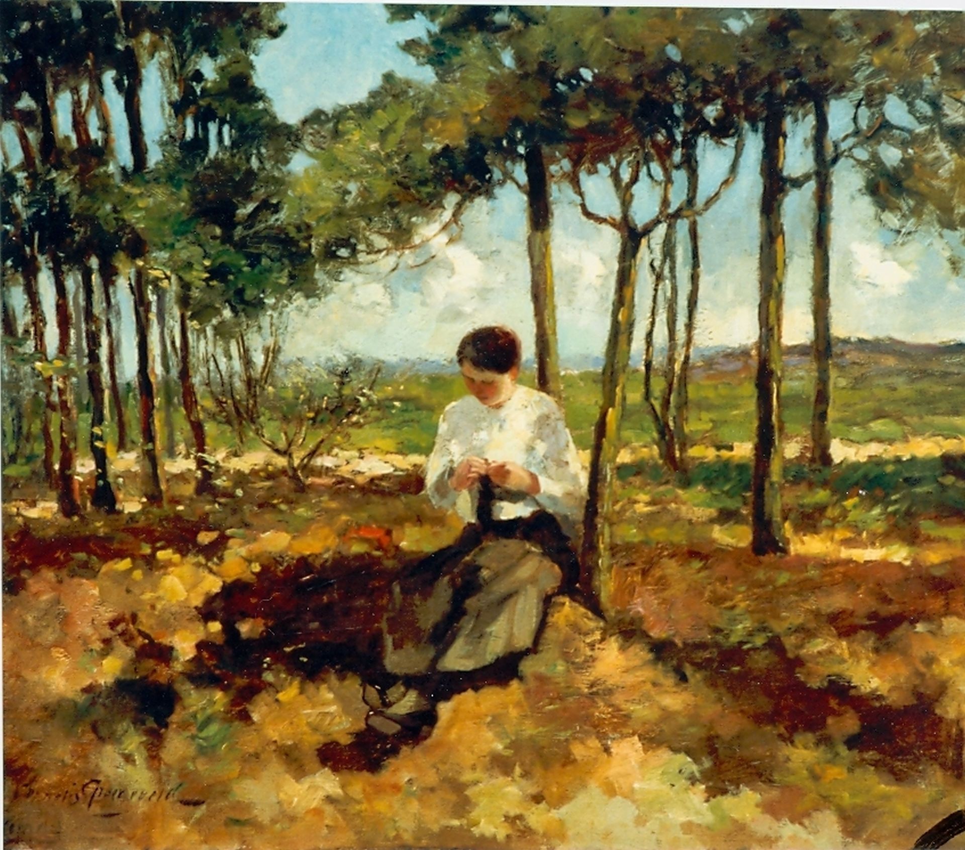 Cornelis Groeneveld kunstwerk • schilderij • voorheen te koop Breiende vrouw aan bosrand
