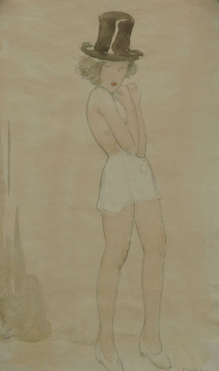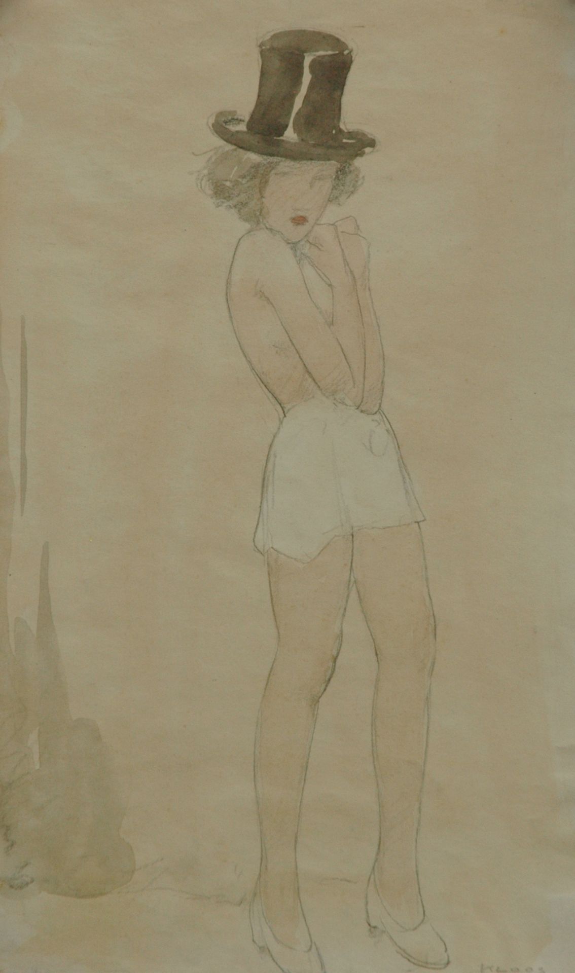 Cornelis Kloos kunstwerk • aquarel • tekening • voorheen te koop Meisje met hoge hoed en wit rokje